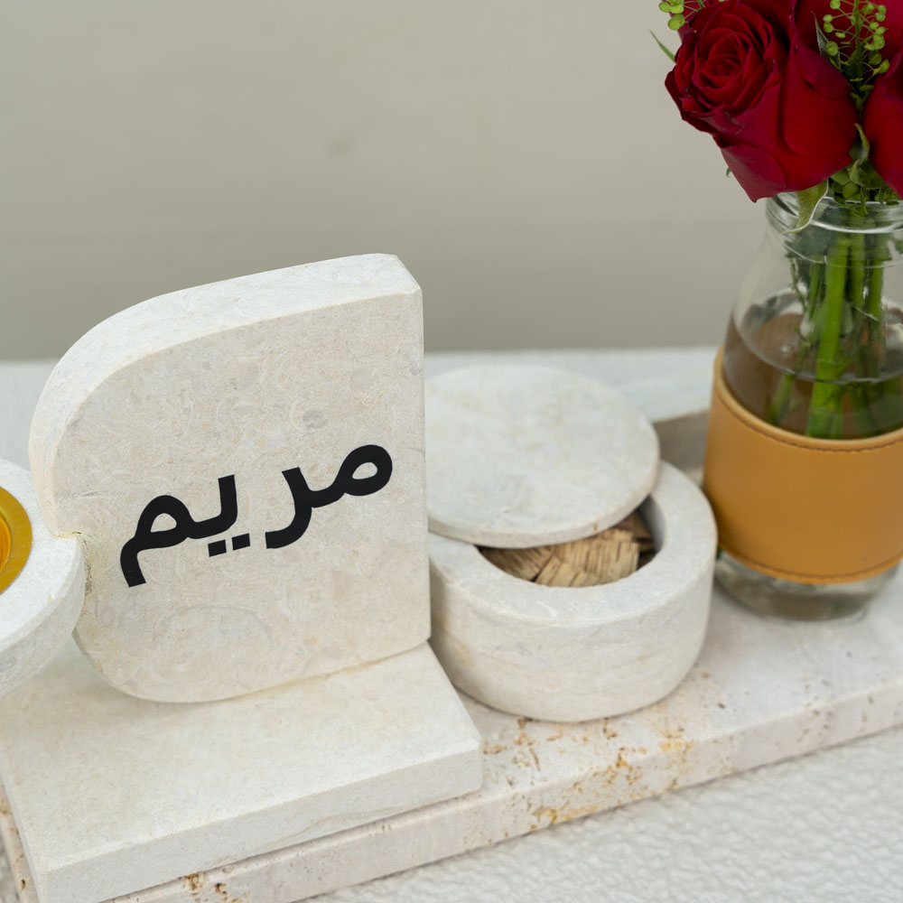 A concrete tray containing a vase decorated with roses, a concrete box filled with Vietnamese incense, and a luxurious incense burner.