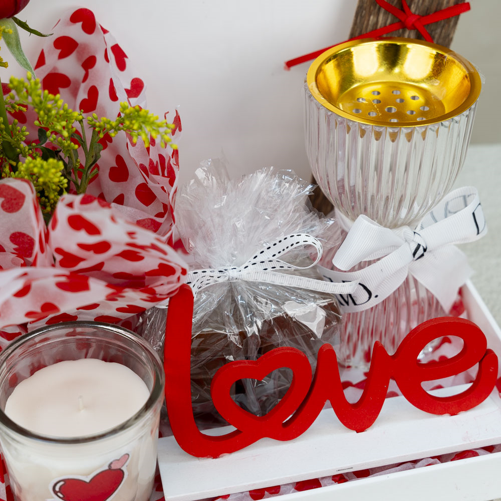 An acrylic stand decorated with roses containing an incense burner, a piece of Vietnamese incense, a vanilla-scented candle, and pieces of Belgian chocolate with a wafer filling.