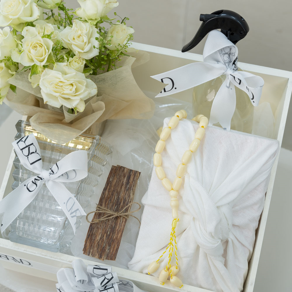 A luxurious wooden box decorated with baby roses containing a Quran, an incense burner with a piece of Malaysian incense, prayer beads, and room freshener.