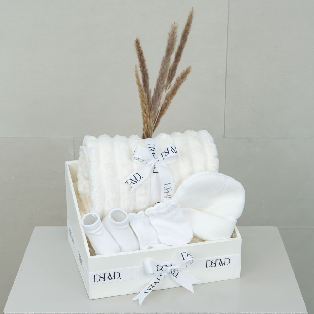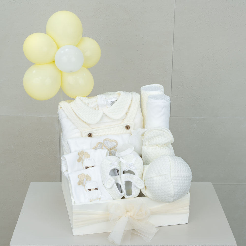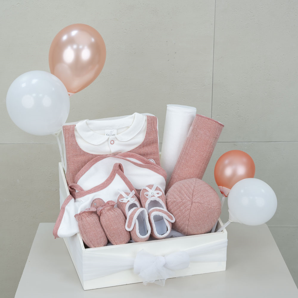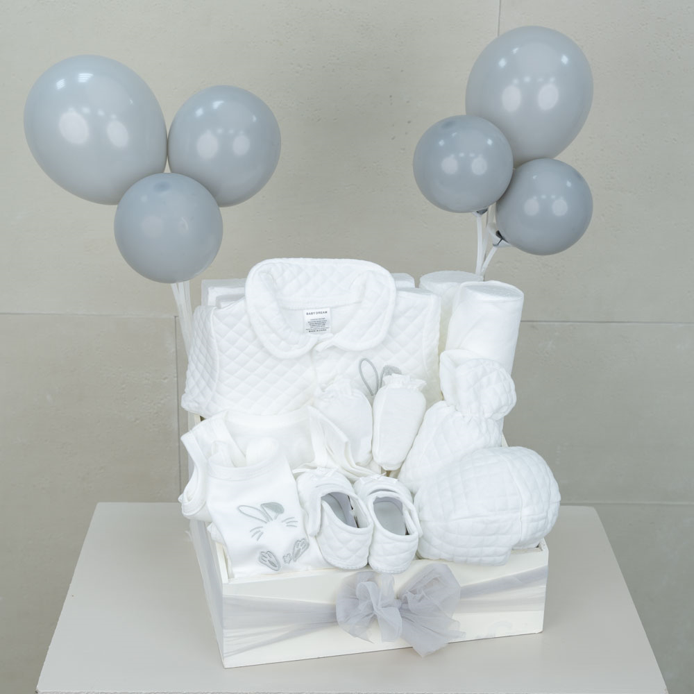 a straw tray contains a mug styled with a balloon and some baby roses, a pair of socks, candle and 6 pieces of chocolates.