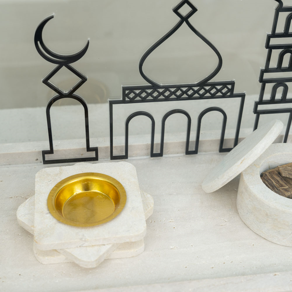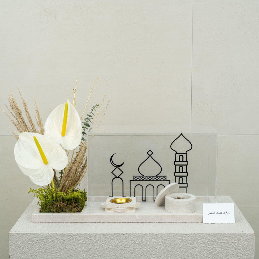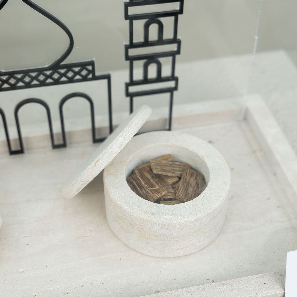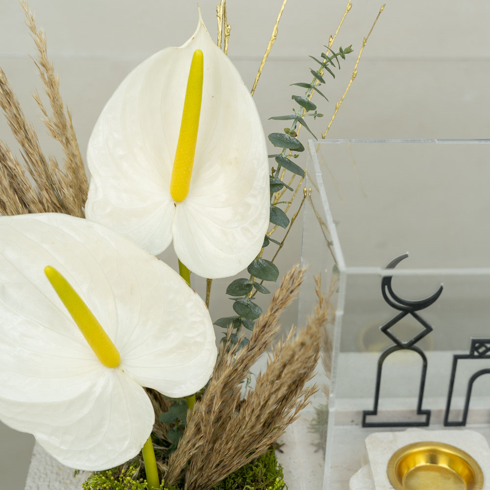 An elegant concrete tray featuring anthurium flowers and an incense burner with incense.
