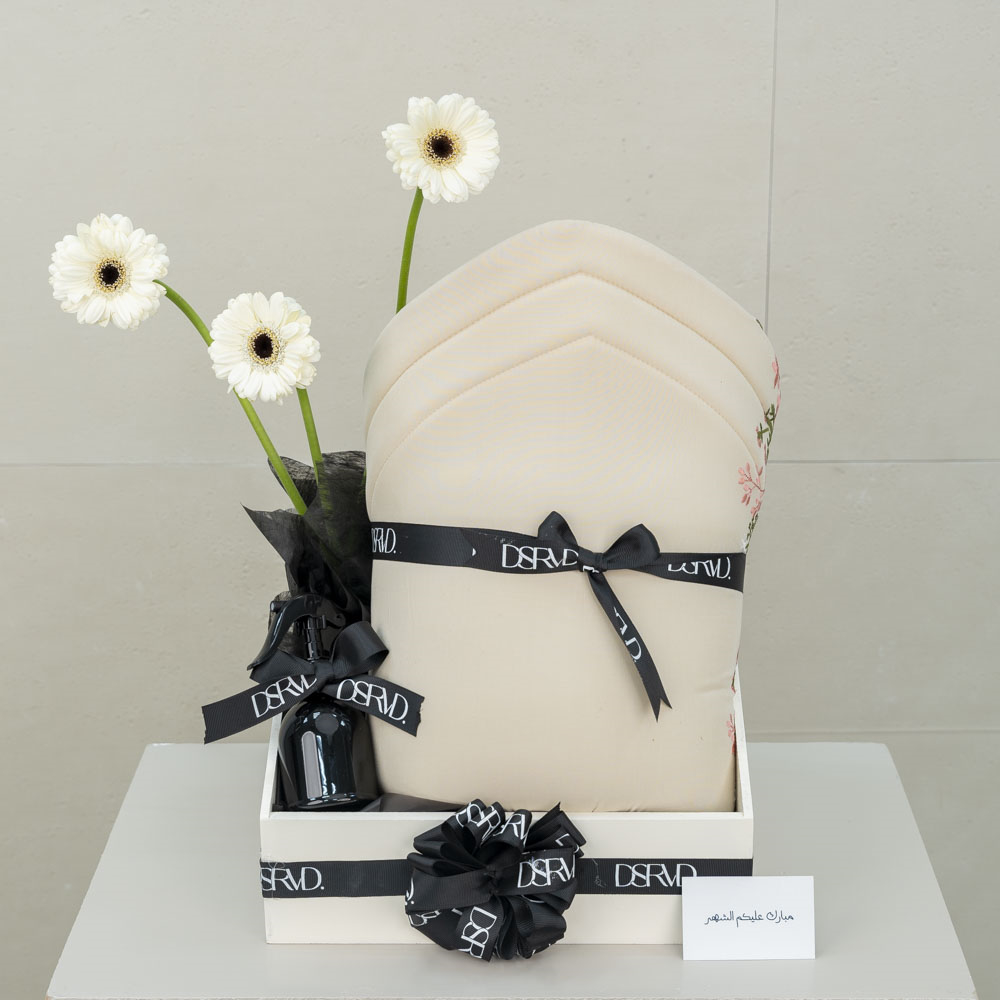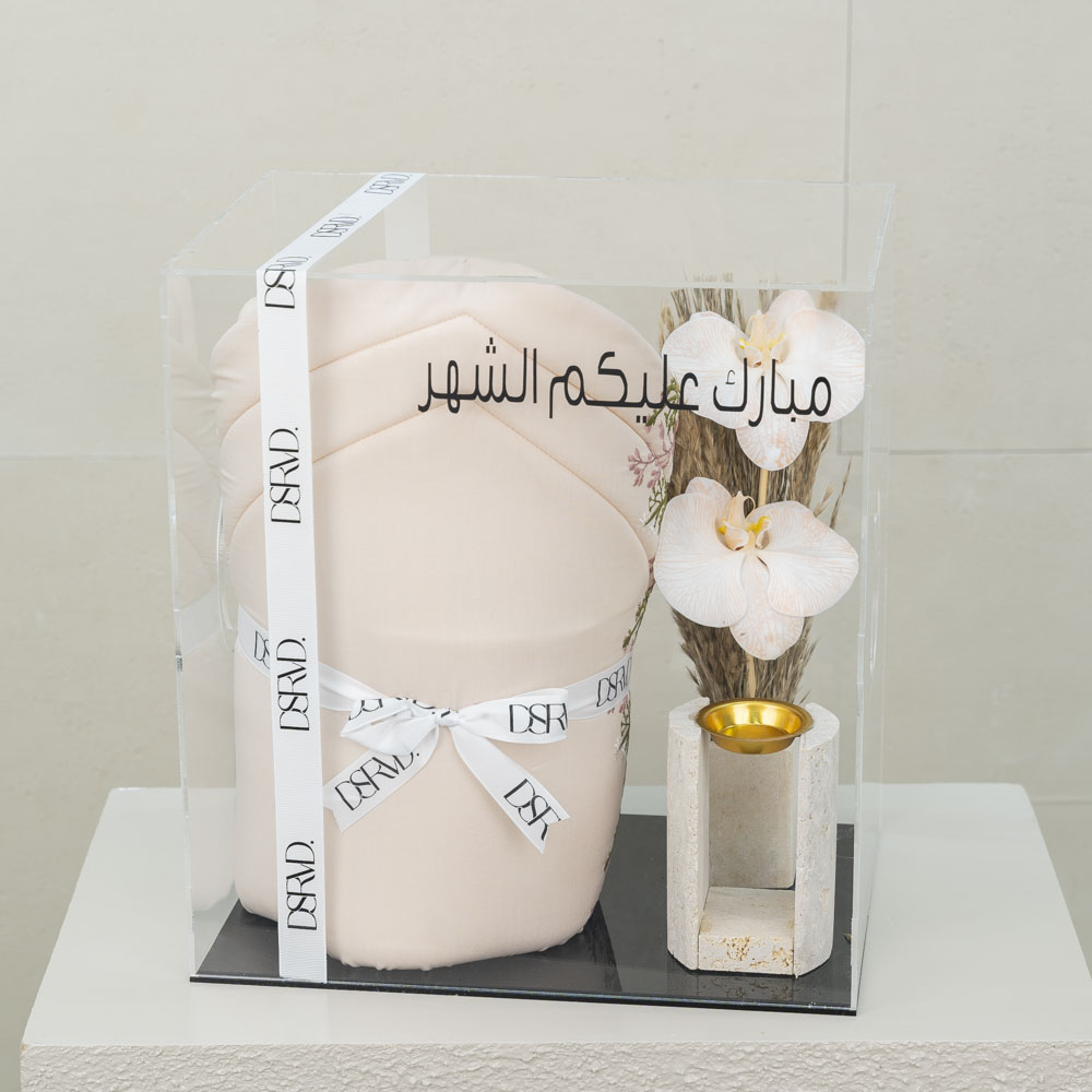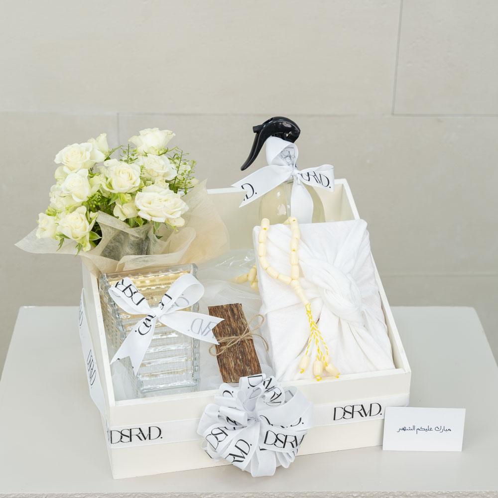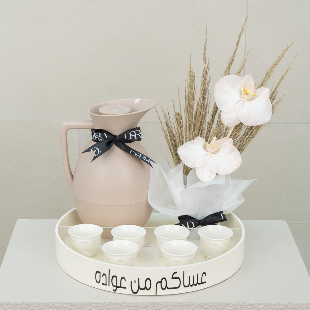 A tray decorated with dry flowers filled with a candle, mubkhar and essential oil diffuser.
