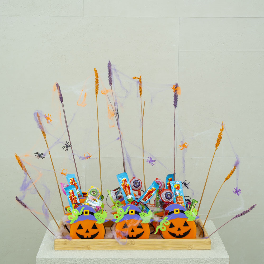 A tray decorated with dry flowers filled with a candle, mubkhar and essential oil diffuser.