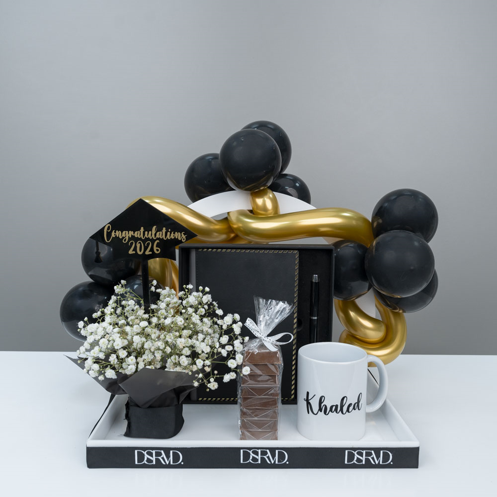 This acrylic tray, styled with balloons and flowers, contains a mug, a notebook with a pen, and chocolates.