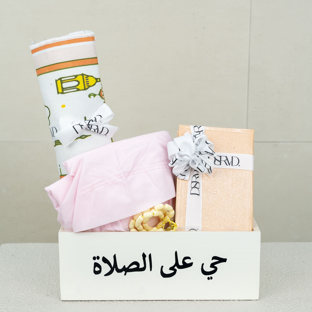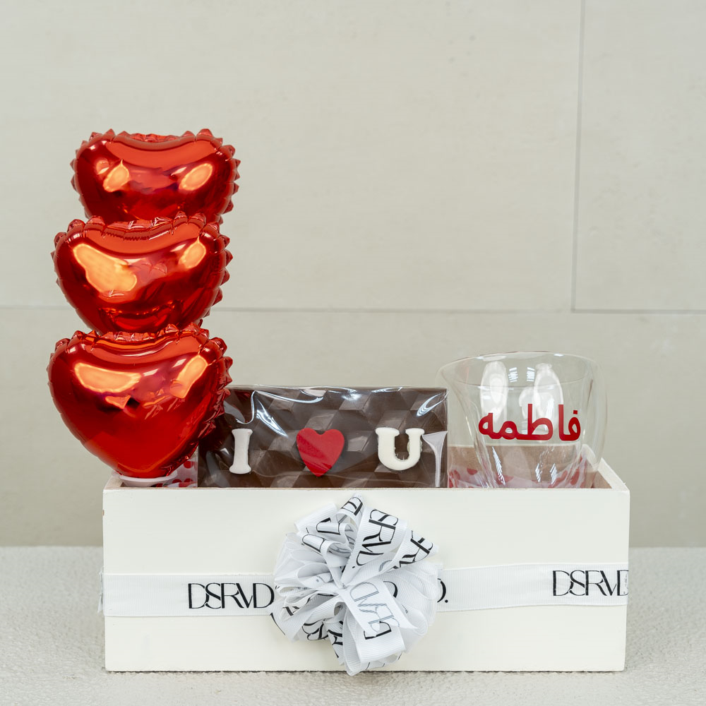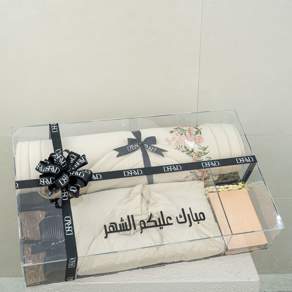 This wooden box, styled with flowers, contains a free-size pajama, a mug, a candle, a facial beauty mask, and a herbal tea.