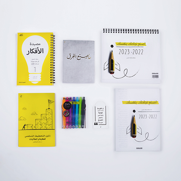 Group back to school 2. The set contains 7 products. Calendar school 2022/23. Agenda school 2022/23. Book museda alafkar. Daleel al takhteet al shakhse. Note- small-make the difference. Mini p1 colors pen 7. Bookmark just a hobby.
