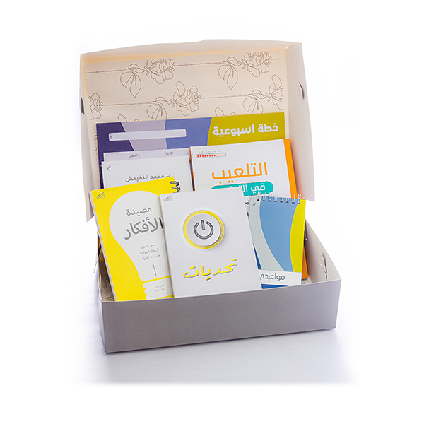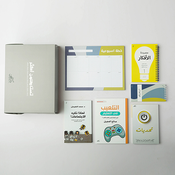 Gift Group Almoalemen The set contains 9 products Large gift box with wrapping paper. Note-Weekly plan A4 (Yell). Book Museda Alafkar. Notepad My Appoint- Yellow. Tahadyat. Lematha Nakrah. Book Al Taleeb.
