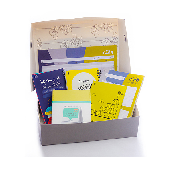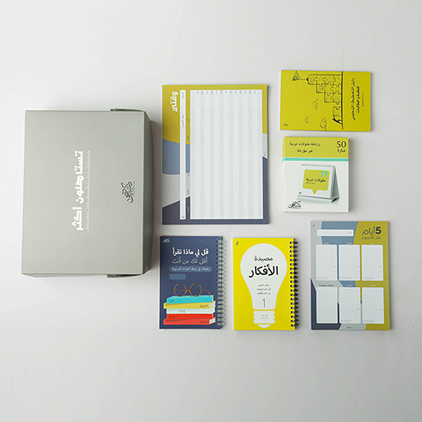 Gift Group Alqiraa The set contains 6 products. Gift Wrapping – Gray Heart. Note – My Time. Note –5 days in weeks- A5(Yell). Book Museda Alafkar. Tell me what you read. Daleel al takhteet al shakhse. Quatations- Maqolat Arabiya.