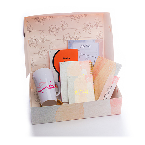 Gift group ashyaa contains 7 products Box with gift wrapping paper. Note my task a5. Book falsafat nuqta. Mothakrat ashyaa. Note big pink. Note small pink. Bookmark inal al quran. Cup.