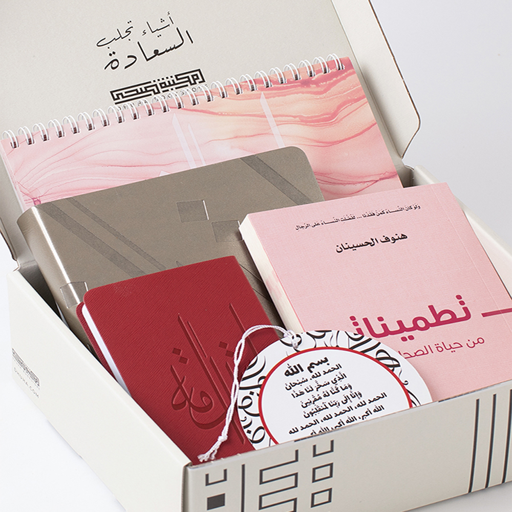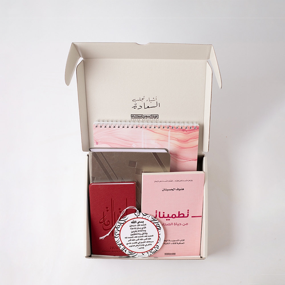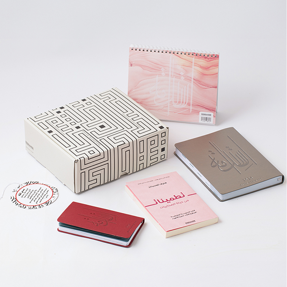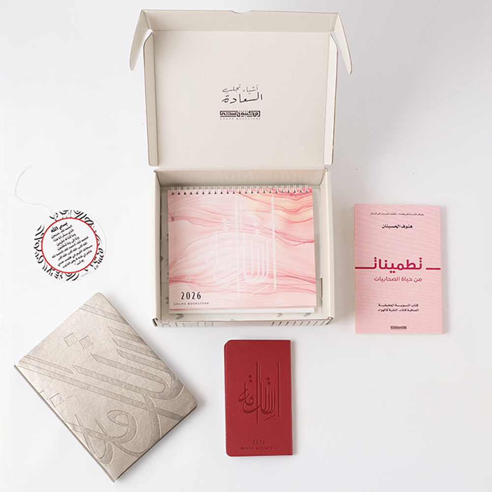 A set that includes 5 items, 2026 pyramid calendar pink, 2026 daily planner silver leather strap, 2026 mini planner burgundy leather strap, book of reassurances, and a doa'a, the set comes in an elegant gray box making it a perfect and special gift.