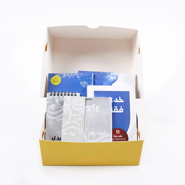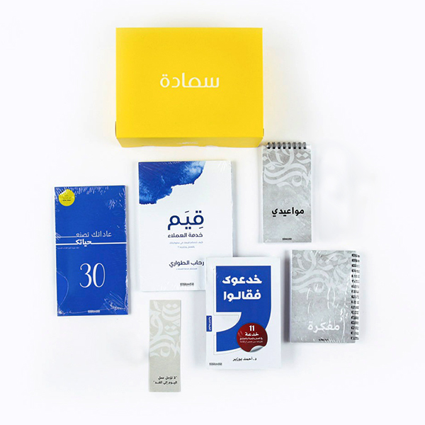 The set contains 6 products. Kedmat alomala book. Khadaok faqalo book. Note blue. Notebook marble. Notepad my appoint marble. Bookmark beige.