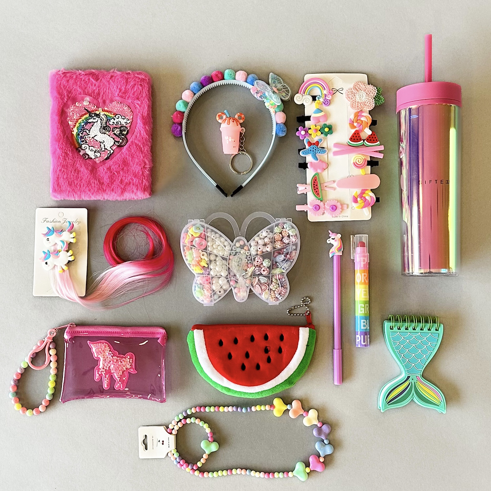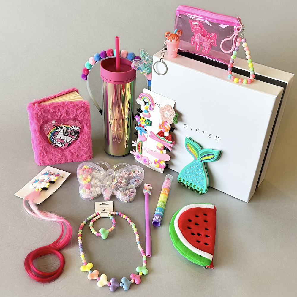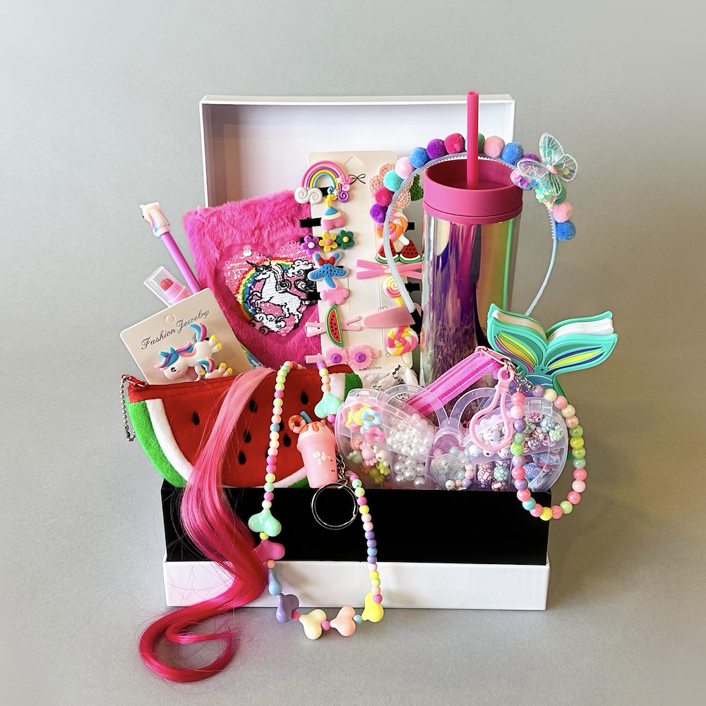 A colorful box of happiness for little ones packed with playful goodies like hair clips, a watermelon keychain pouch, unicorn accessories, mermaid notebook, diy beading kit, pen, highlighter, tumbler, and more, full of color fun and imagination.