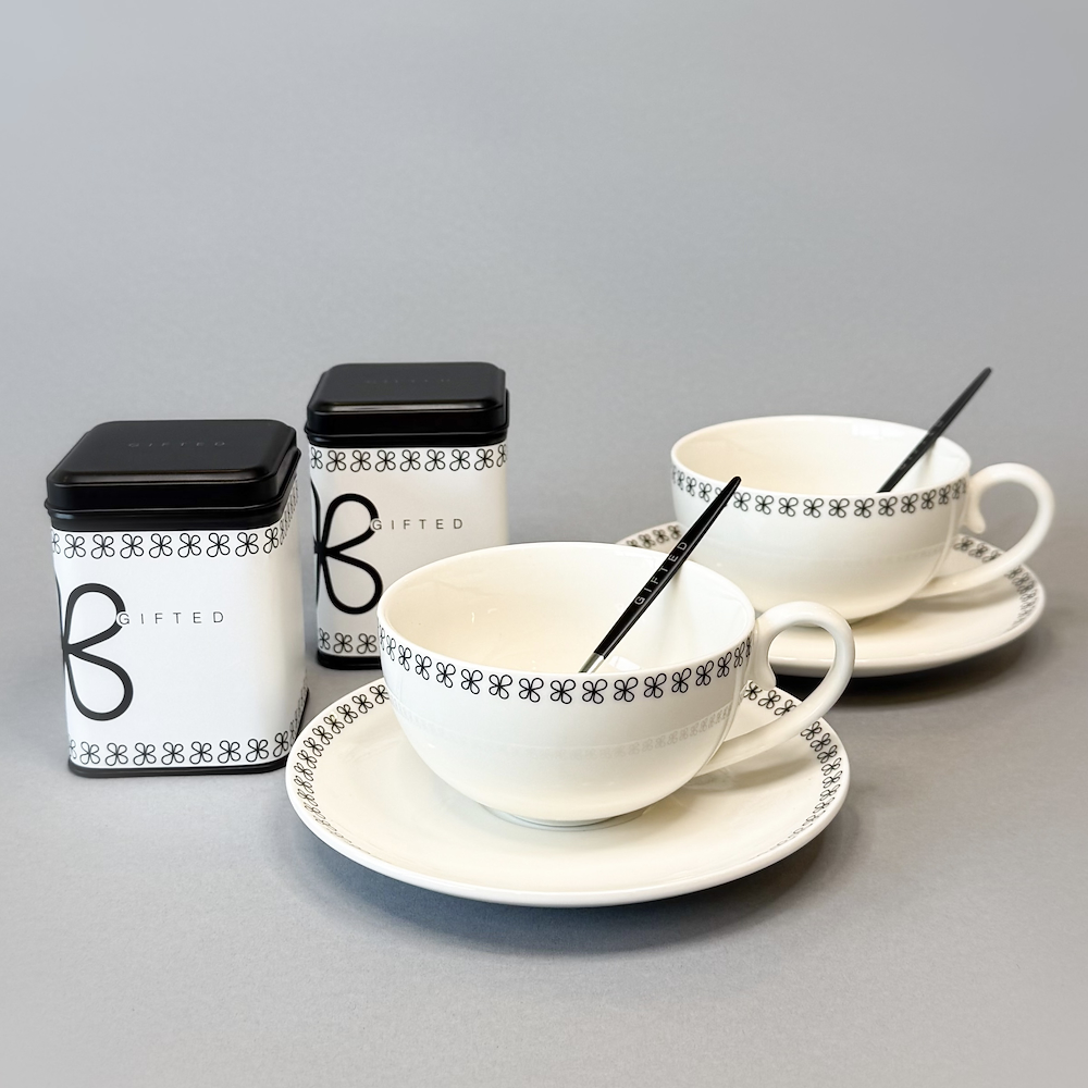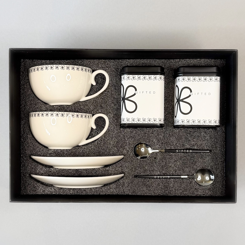 A refined serving set designed for elegant coffee and tea moments, elite sip includes two premium cups with matching saucers, two stainless steel spoons, two multi purpose tins, all beautifully arranged in a luxurious gift box, the perfect gift for every occasion, it comes with Ahmad tea mixed tea bags.