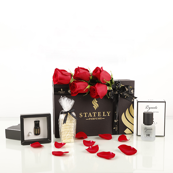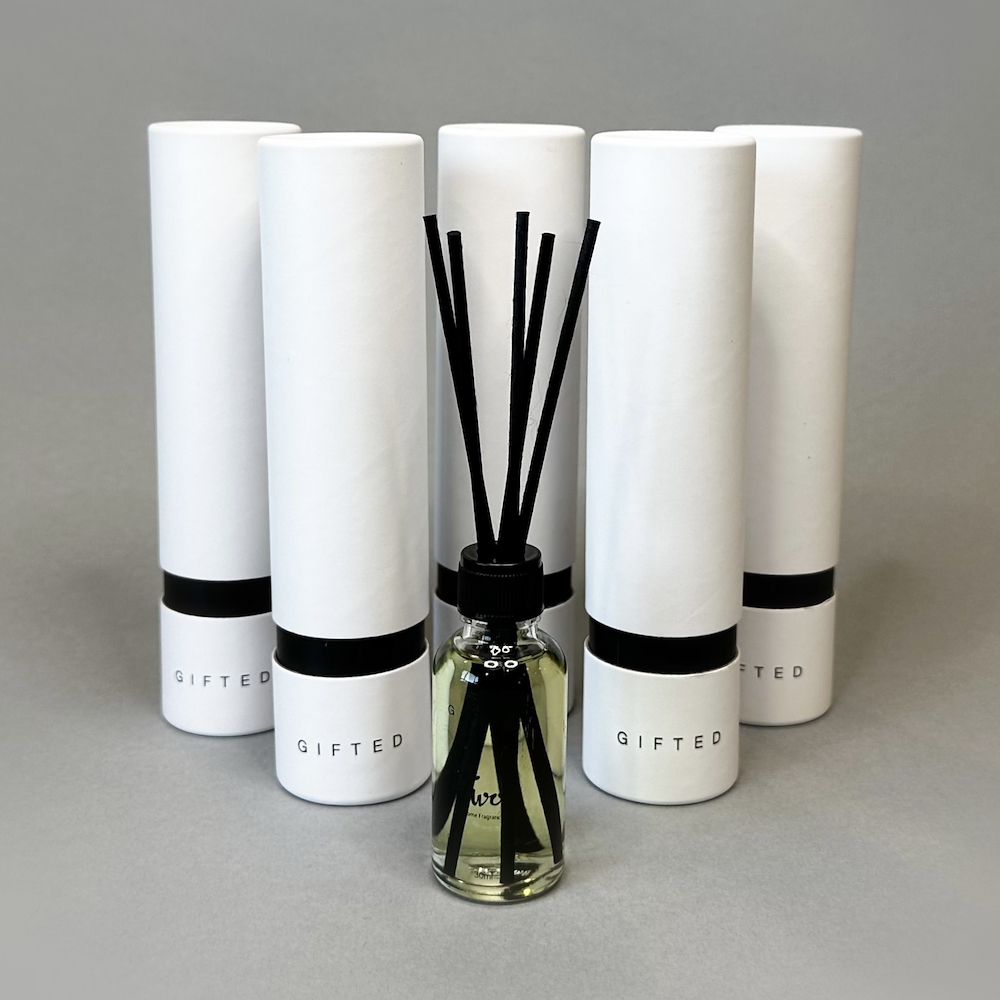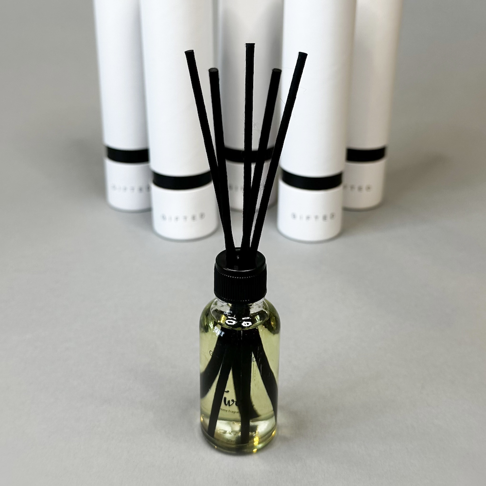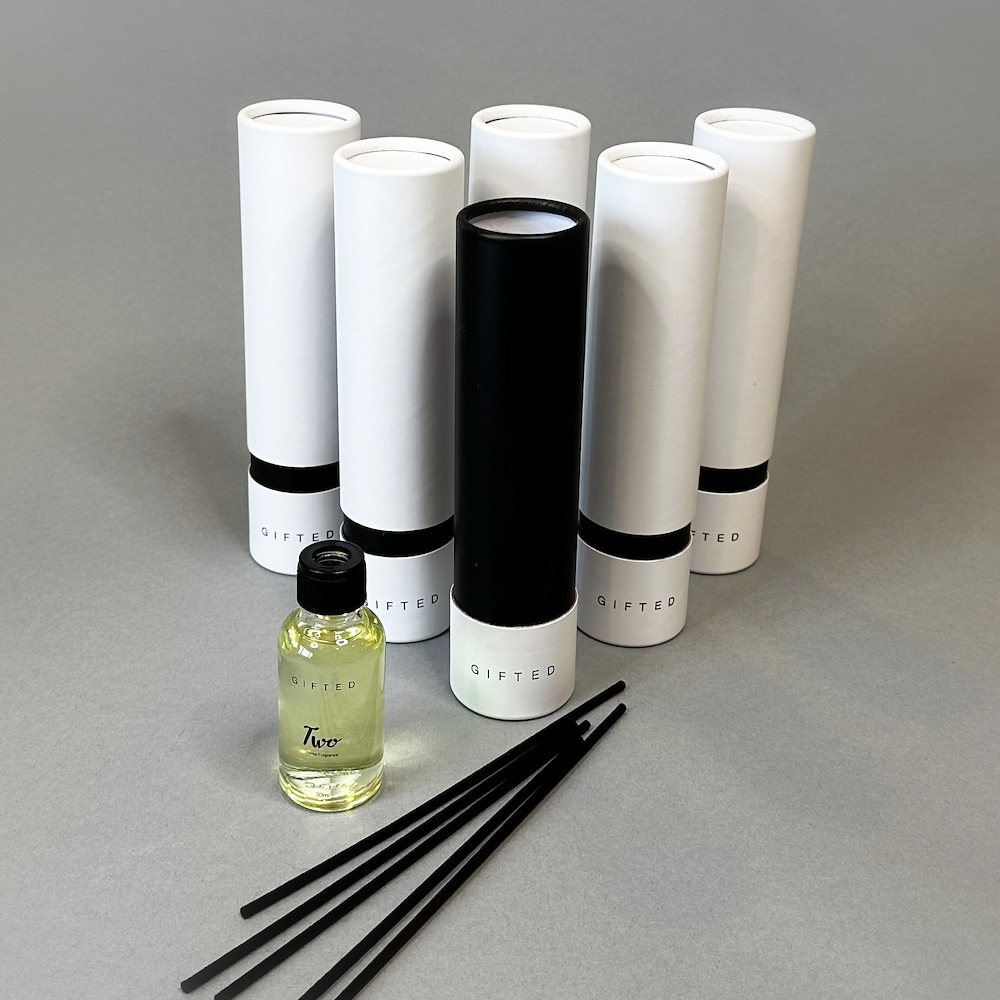 Six mini 30 ml diffusers: two gifted: rose, patchouli, mandarin, musk, vanilla, and jasmine. They come with a hard bord gift box.