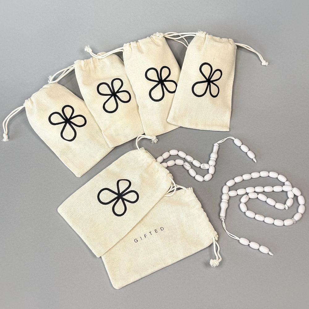 6 misbah giveaways, each presented in its own premium pouch, perfect for ramadan gatherings, events, or thoughtful gifting.
