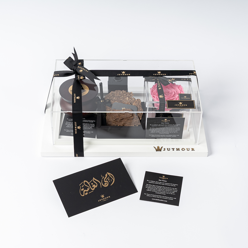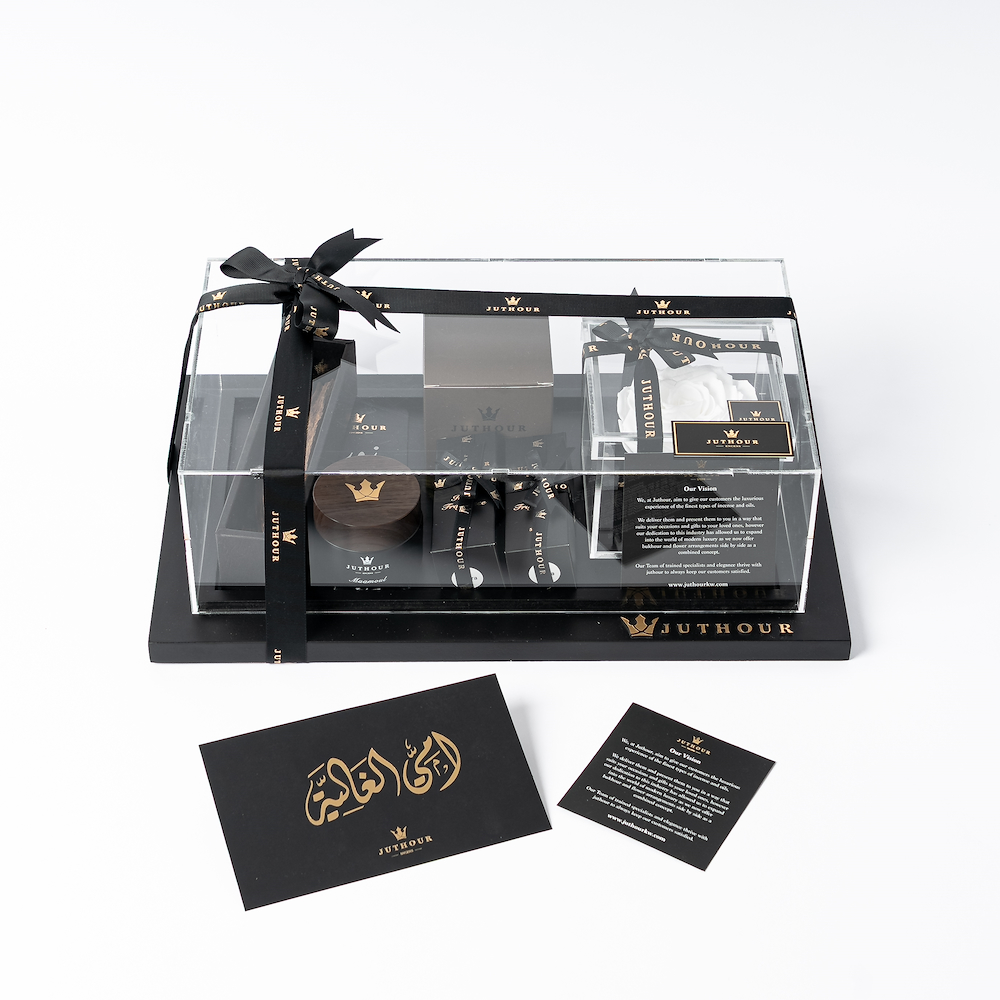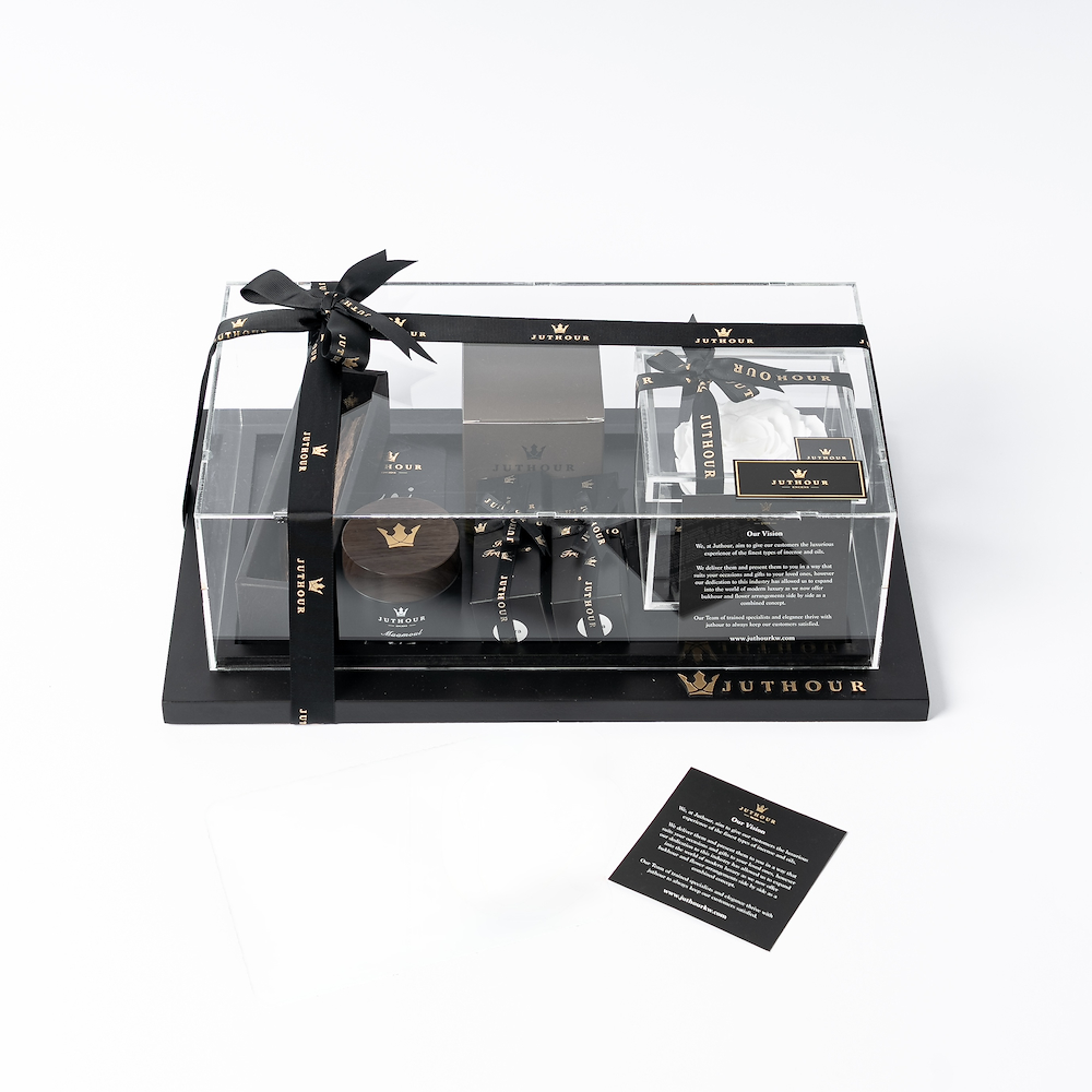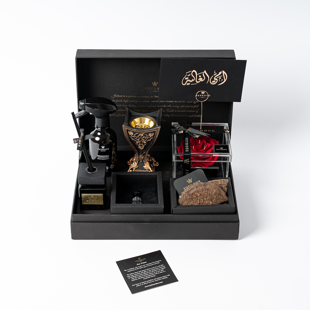 This exclusive Housewarming Edition gift box is designed to bring elegance and warmth to any home. It includes a 100 ml Northern Diffuser, two 300 ml best-selling sprayers, the luxurious classic Mubkhar of Juthour, and a Tula of premium Indian Char Bokhour. The set is completed with a gift card and an elegant flower arrangement, making it the perfect present for housewarming celebrations.