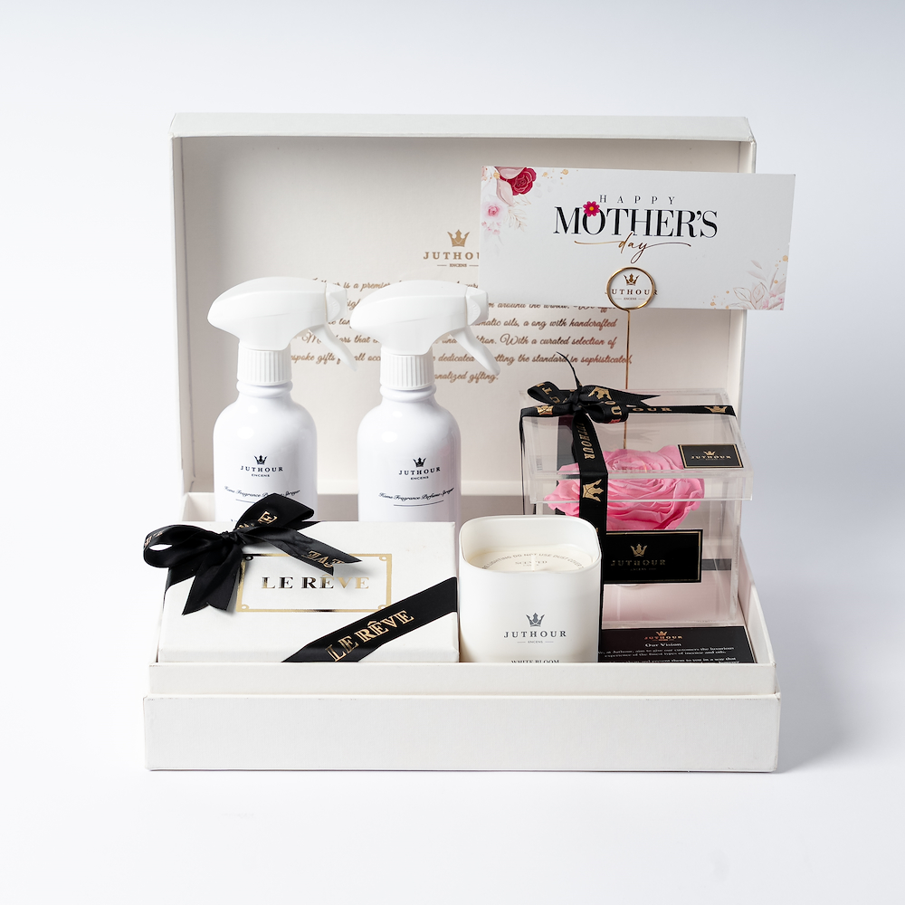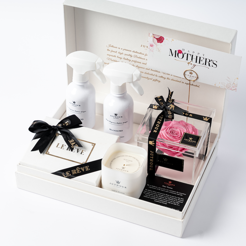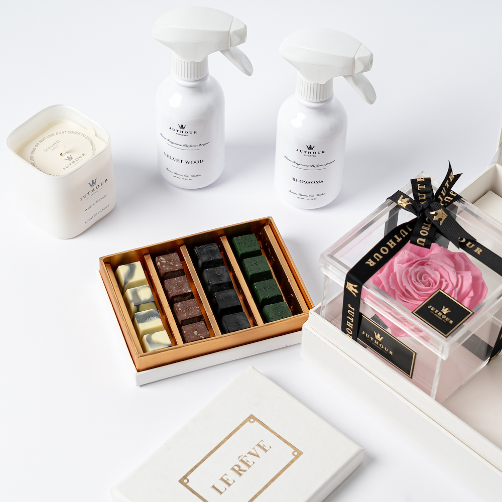 A box by Juthour featuring an elegant pink eternal flower, a 280g White Bloom scented candle, two 300 ml sprays of the best sellers, and 200g of mixed chocolate from Lereve. The gift is beautifully finished with an occasion card and a personalized gift card.