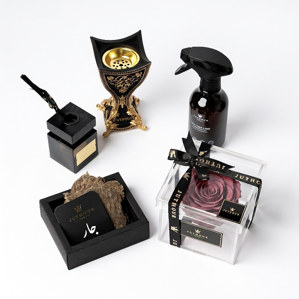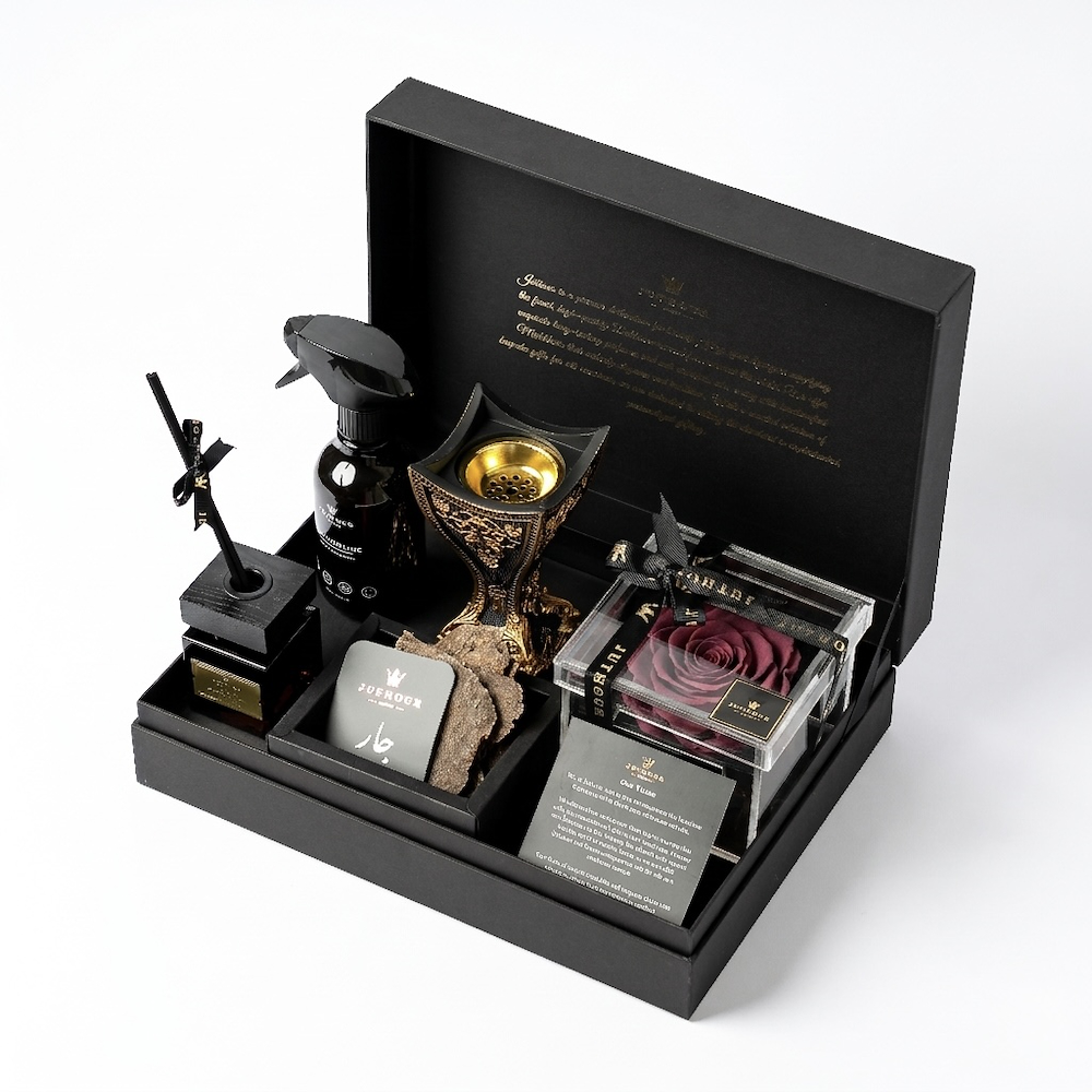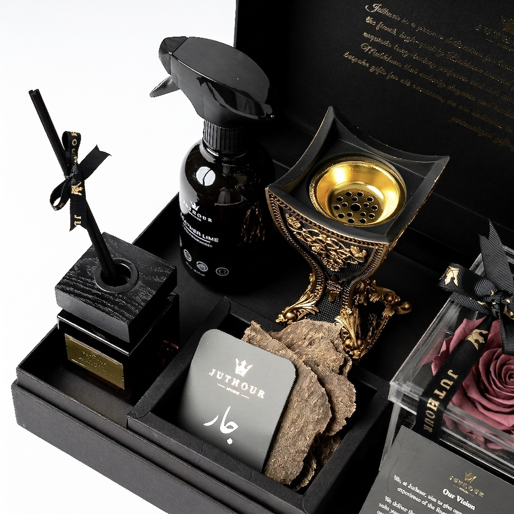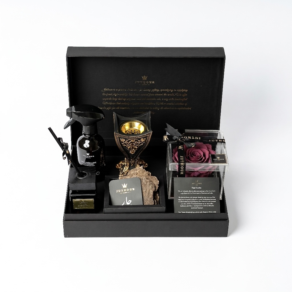 A box that features an elegant purple eternal flower, a 100 ml Northern Diffuser, Juthour’s elegant classic mubkhar, 1 tola of the luxurious Char Bukhour, and 1 sprayer of the best-selling fragrance in a 300 ml size, beautifully finished with an occasion card and a personalized gift card.