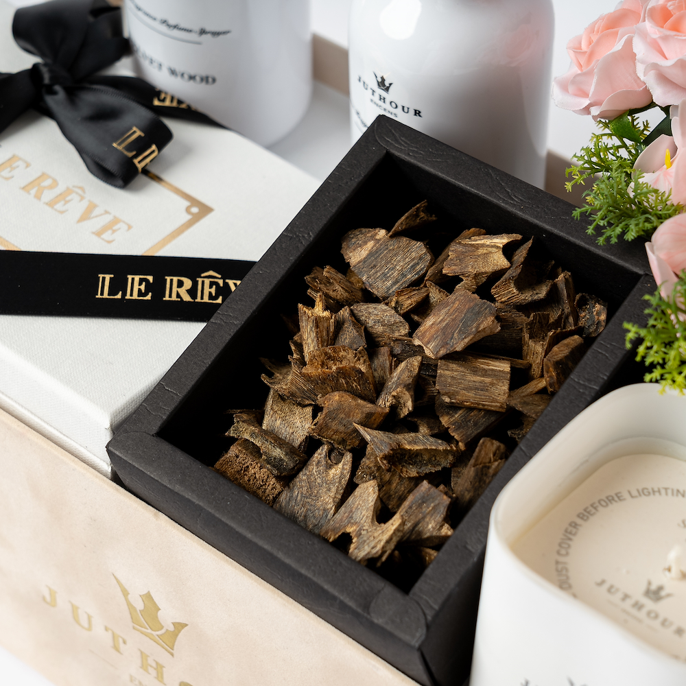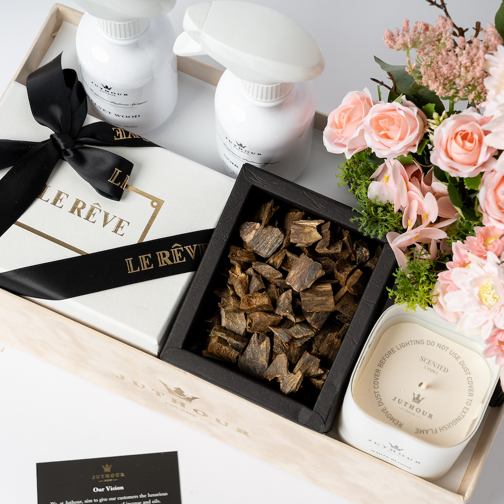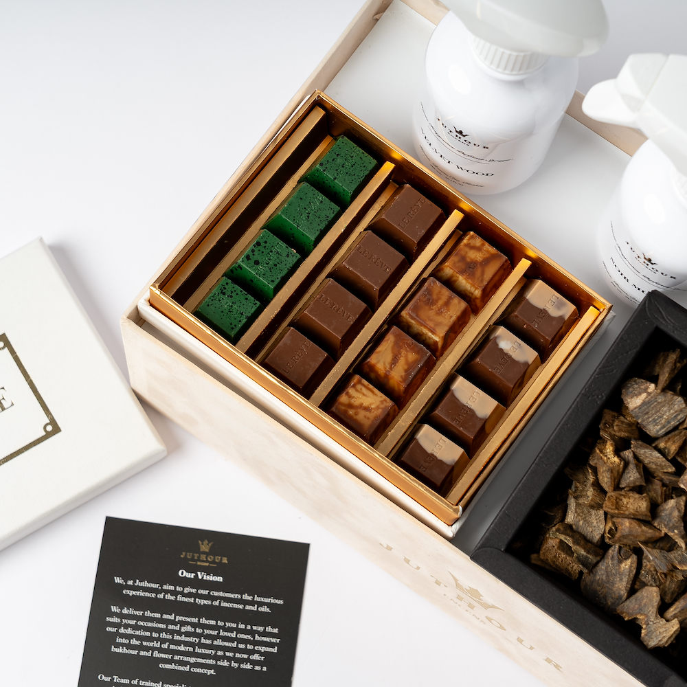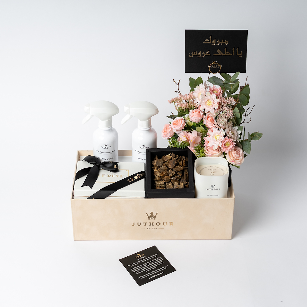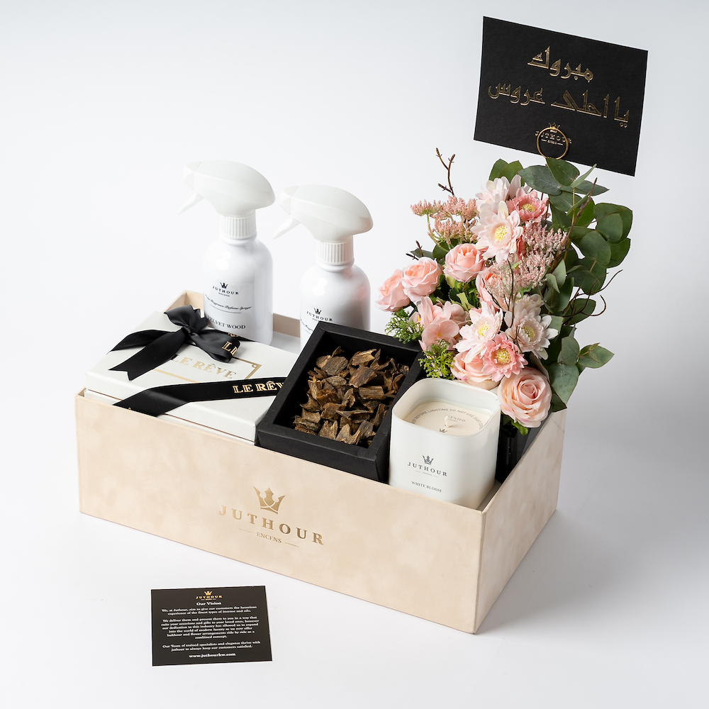 A Juthour box featuring 1 tula of the luxurious Dasman Bukhour, the amazing 280-gram White Bloom scented candle, 2 of Juthour’s best-selling 300 ml sprayers, and 200 grams of a mix of the best-selling chocolate from Lereve. The gift is completed with an elegant occasions card, a personal gift card, as well as an elegant mix of artificial flowers and natural leaf arrangements from Juthour.