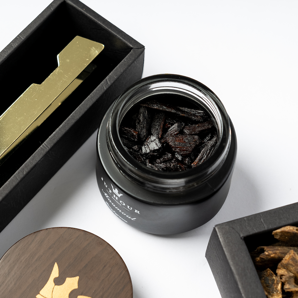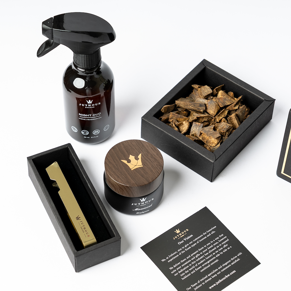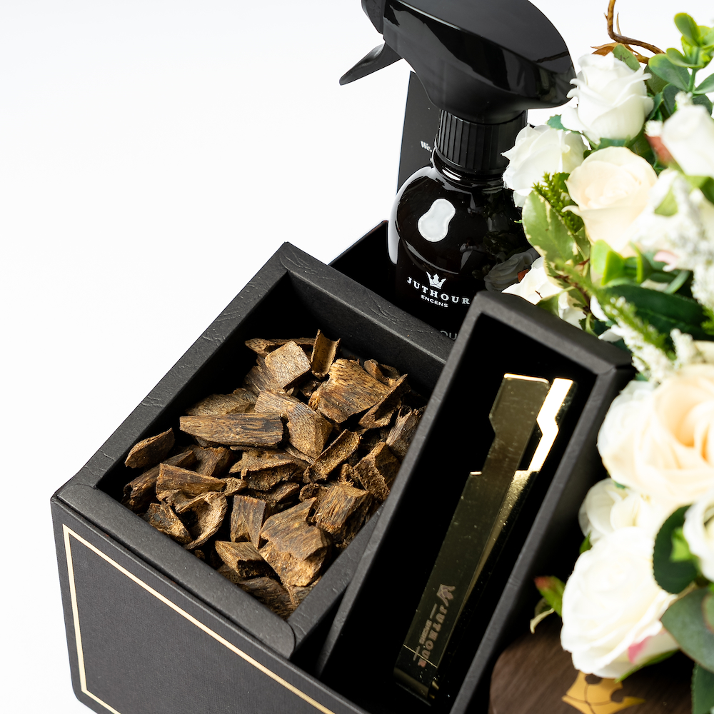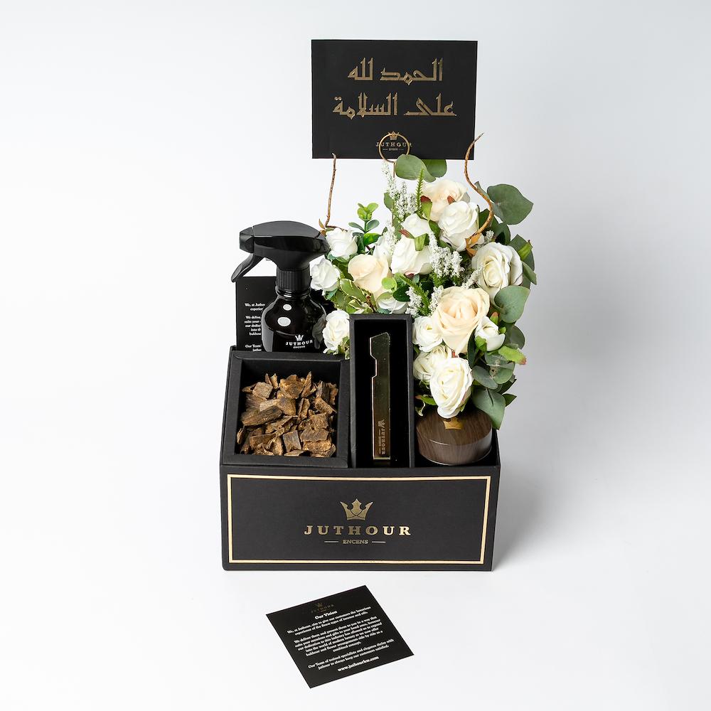 A Juthour box featuring 1 tula of the luxurious Dasman Bukhour, 1 of Juthour’s best-selling 300 ml sprayers, Juthour Maamoul, 3 tula of Iqriged Oud, and a luxurious Juthour gold tong. The gift is completed with an elegant occasions card, a personal gift card, as well as an elegant mix of artificial and natural flower arrangements from Juthour.