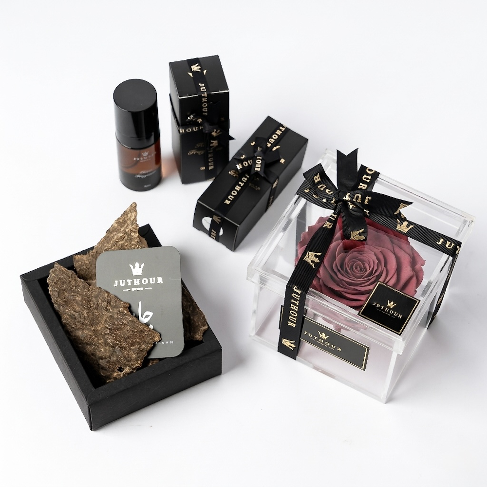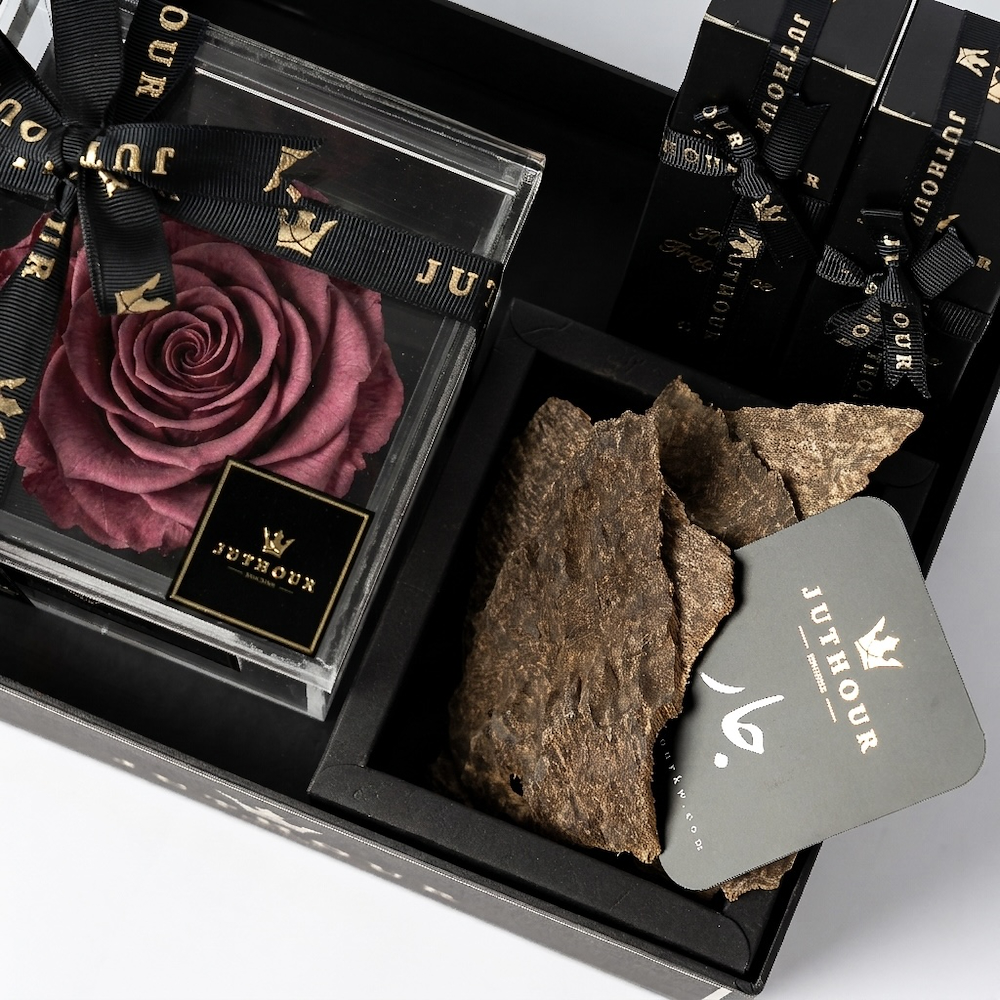 A gift box from Juthour featuring an elegant purple eternal flower, 1 tula of the exclusive high-grade Char bukhour, and 2 sprayers in 50 ml from the best-selling collection. The gift also includes an occasion card and a personalized gift card.