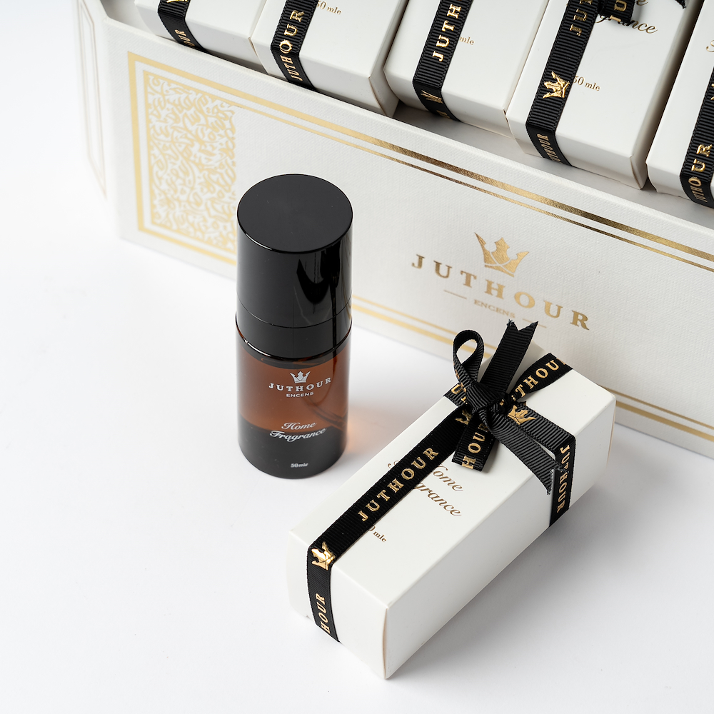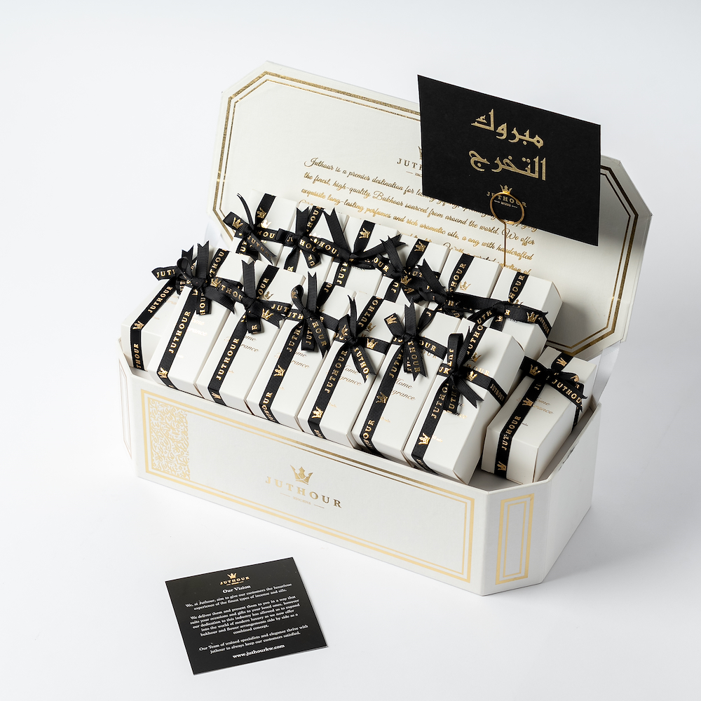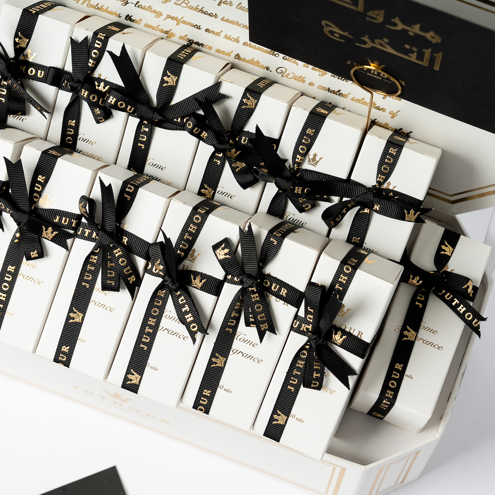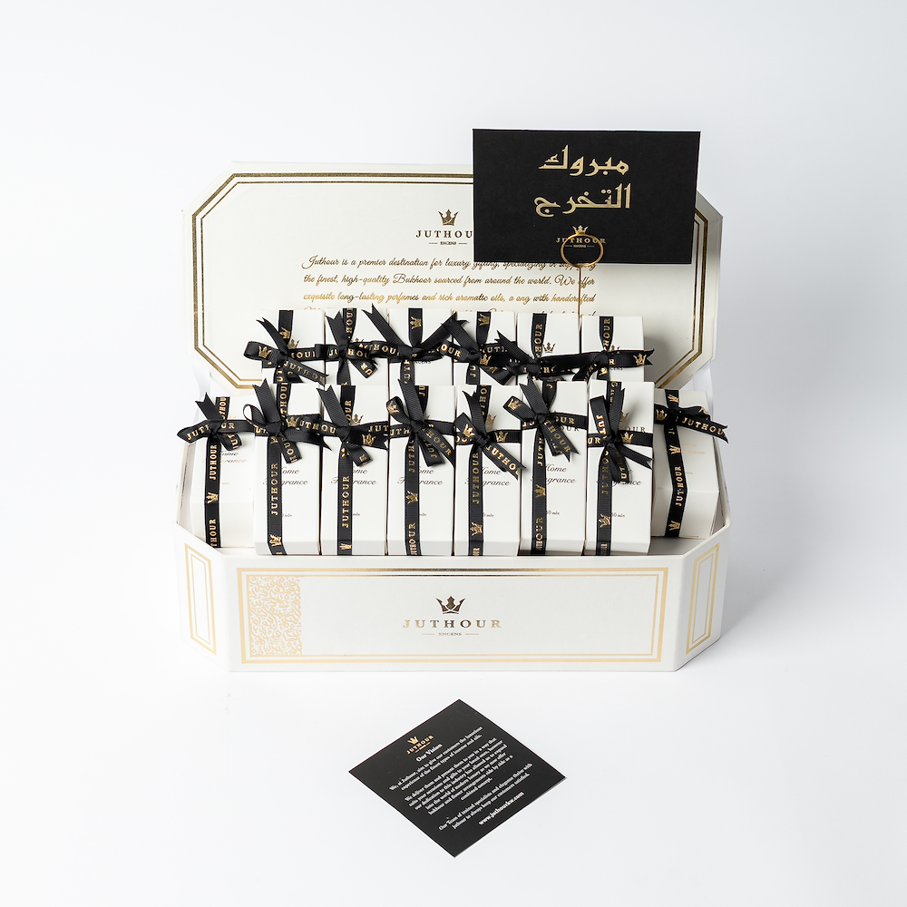 A Juthour Giveaway’s box featuring 14 elegant giveaways of 50 ml elegant sprayers, with a mix of 7 different amazing scents.