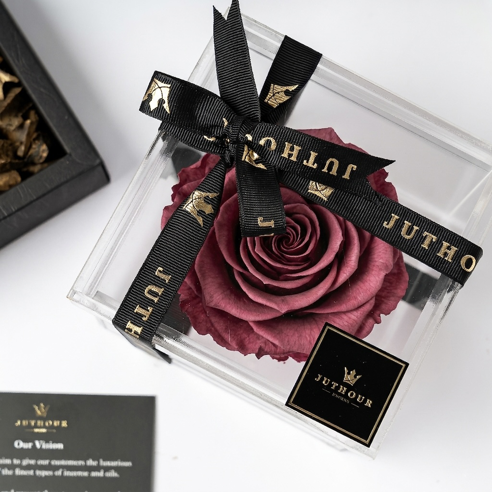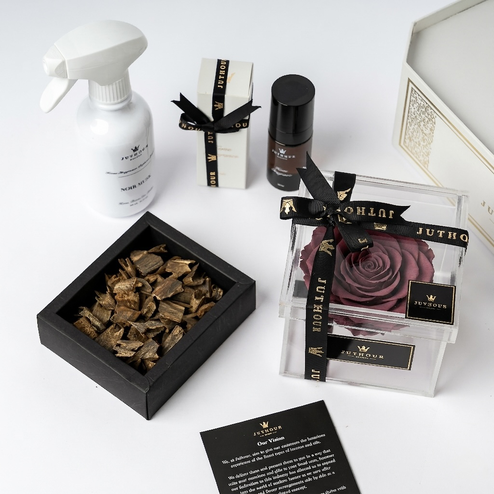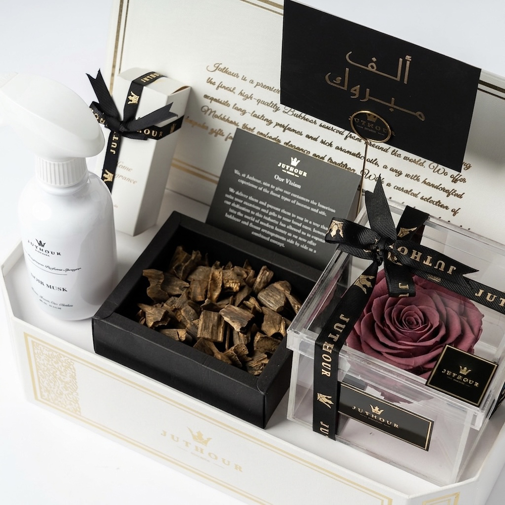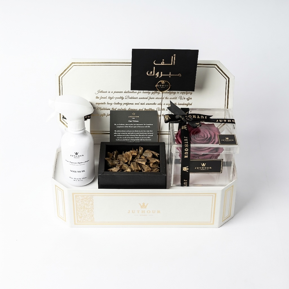 A Juthour box featuring an elegant purple eternal flower, 1 tula of the luxurious Dasman bukhour, a 300 ml white sprayer, and 1 mini sprayer in 50 ml from the best-selling scents. The gift is beautifully completed with an occasion card and a personalized gift card.