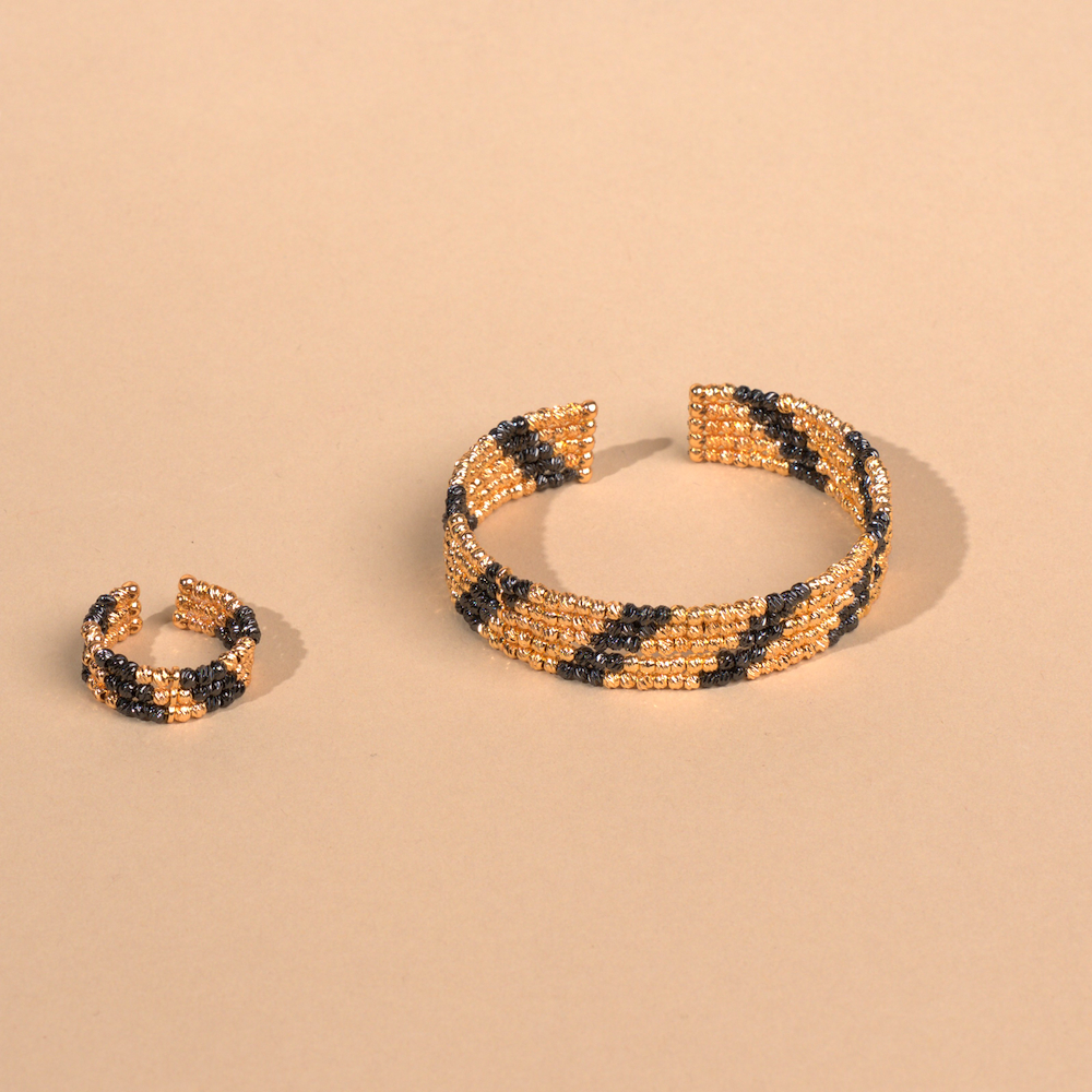 Elegant Dorica bracelet and ring set, 18K gold plated with a stylish golden finish and a unique black touch. Free size, comfortable and perfect for everyday wear and special occasions.
