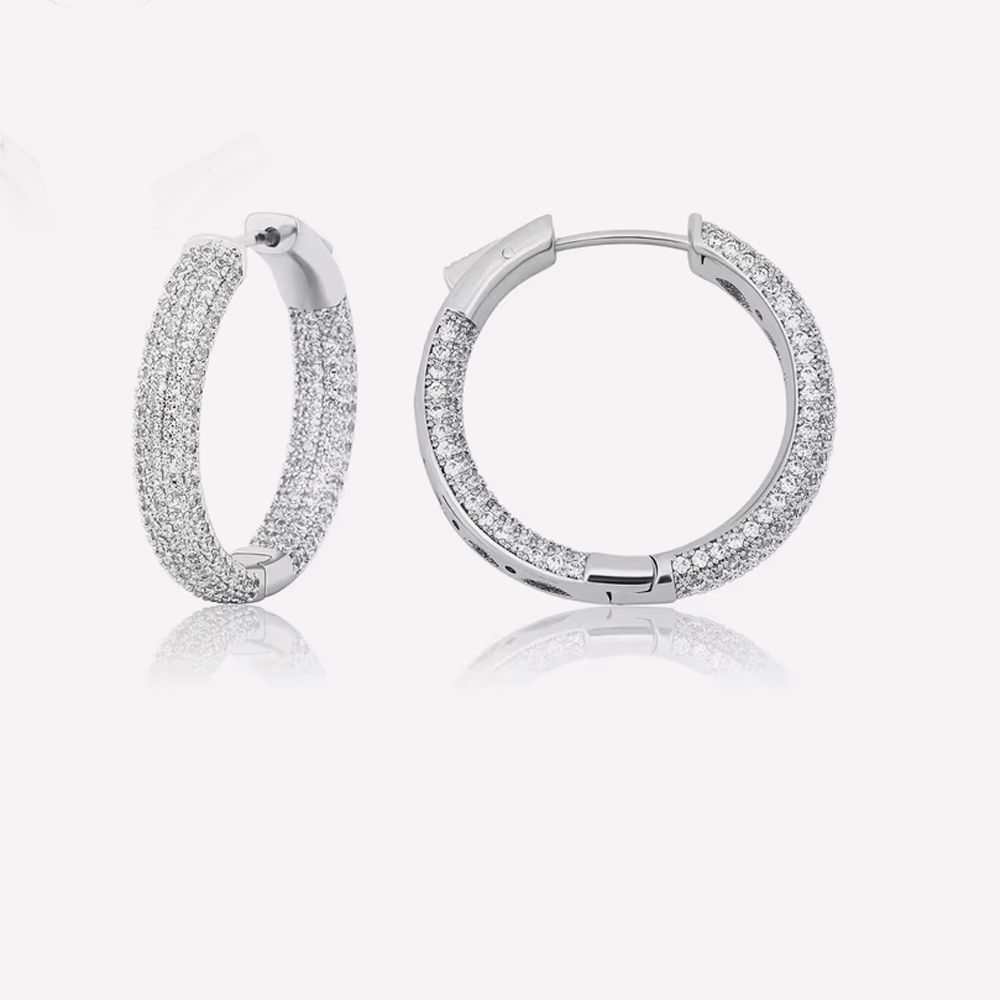 A 925k sterling silver hoop earring featuring sparkling pure zircon stones, set in original rhodium plating to ensure timeless elegance that enhances any outfit. Each zircon stone is carefully selected for its brilliance and clarity, creating a mesmerizing effect that catches the light from every angle. The earring is designed for both comfort and style, making it perfect for special occasions as well as everyday wear. The product is plated with the precious metal rhodium to ensure colour quality and a perfect, long-lasting lustre.