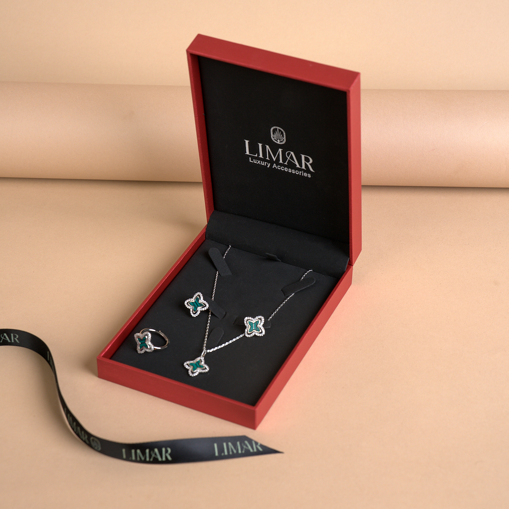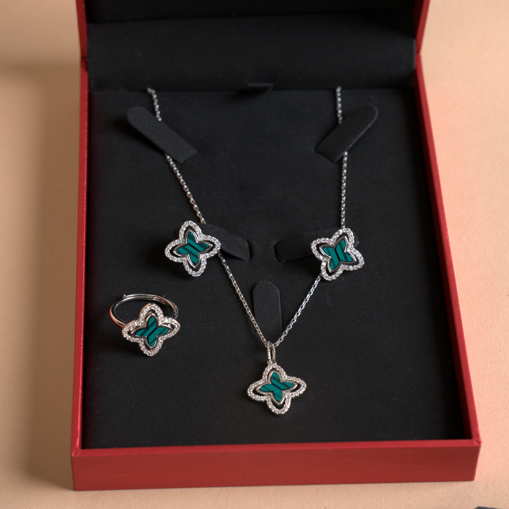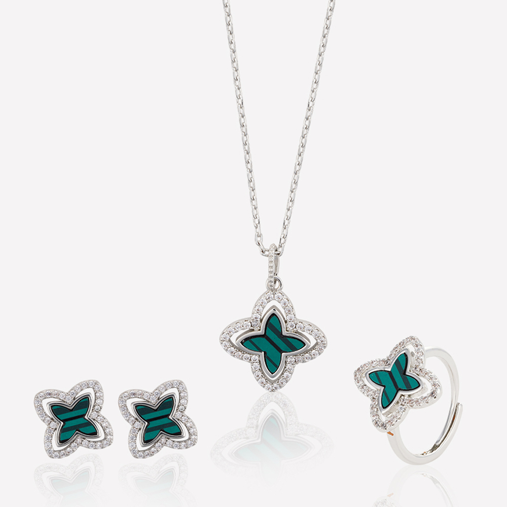 A stunning white gold-plated set featuring sparkling pure zircon and malachite color details, with each zircon stone carefully selected to reflect light in every direction. Perfectly blending sophistication and contemporary style, this set makes a striking statement for any occasion and adds a touch of luxury to your jewelry collection. Embrace your timeless beauty with these captivating accessories.