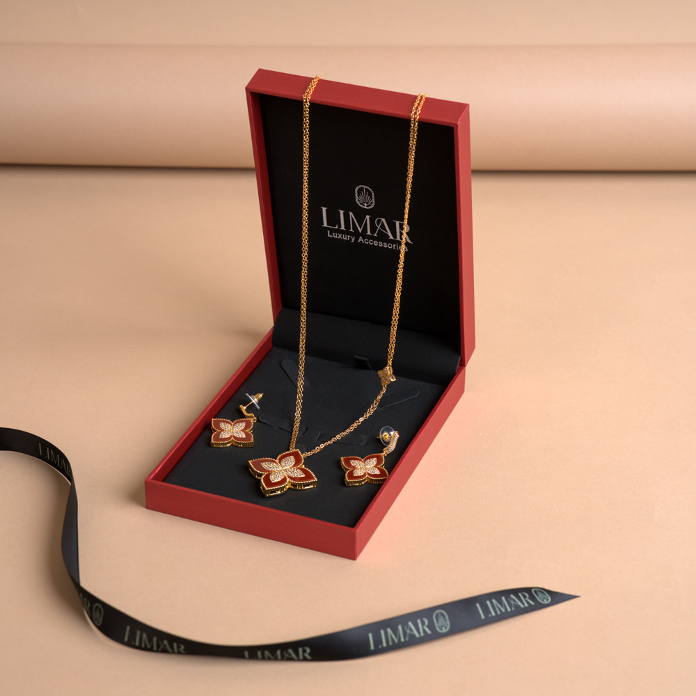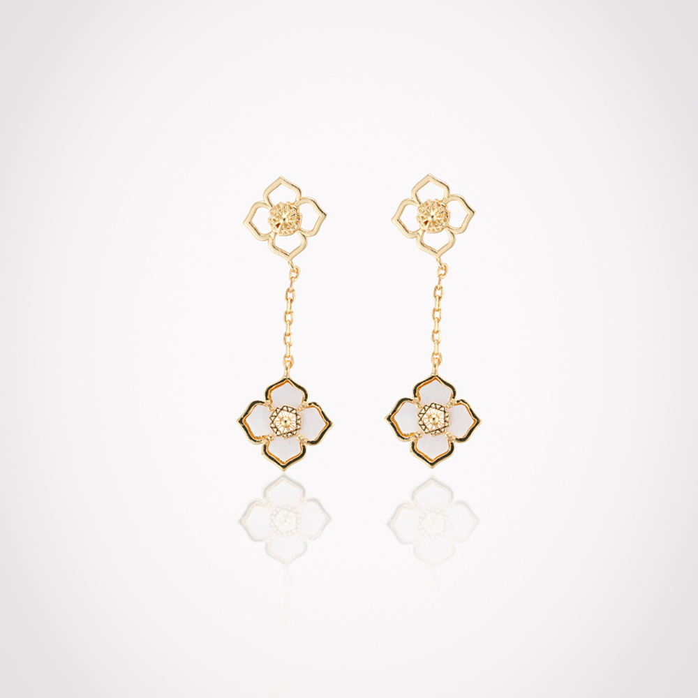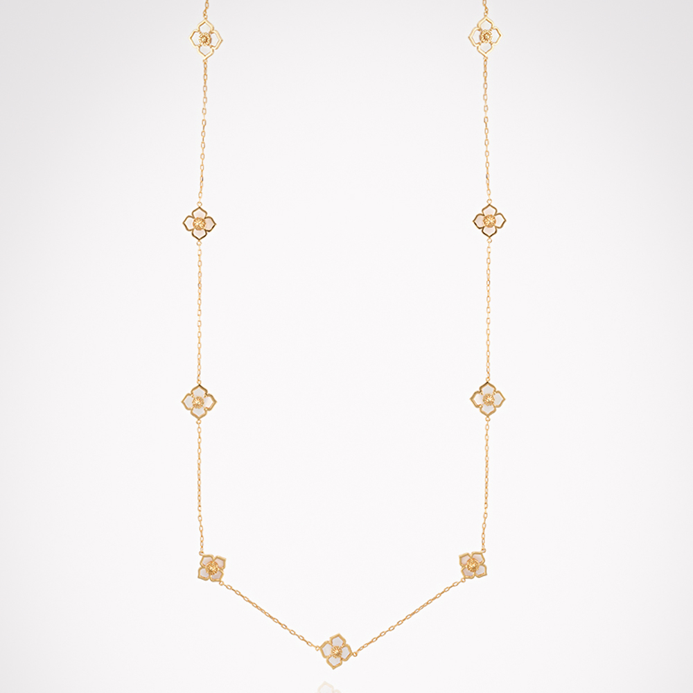 A yellow gold plated long necklace with earrings adorned with mother of pearl, perfectly blending sophistication and contemporary style. This stunning set makes a striking statement for any occasion and adds a touch of luxury to your jewellery collection.