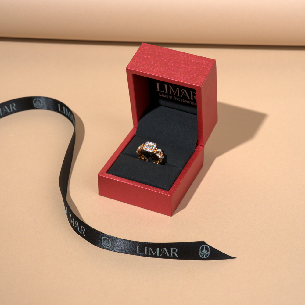 A yellow gold plated square ring featuring a unique design adorned with pure zircon with each stone carefully selected to reflect light from every angle the glow of the yellow gold plating and the high quality zircon add a touch of timeless elegance making it a perfect piece for formal events special celebrations or everyday wear.