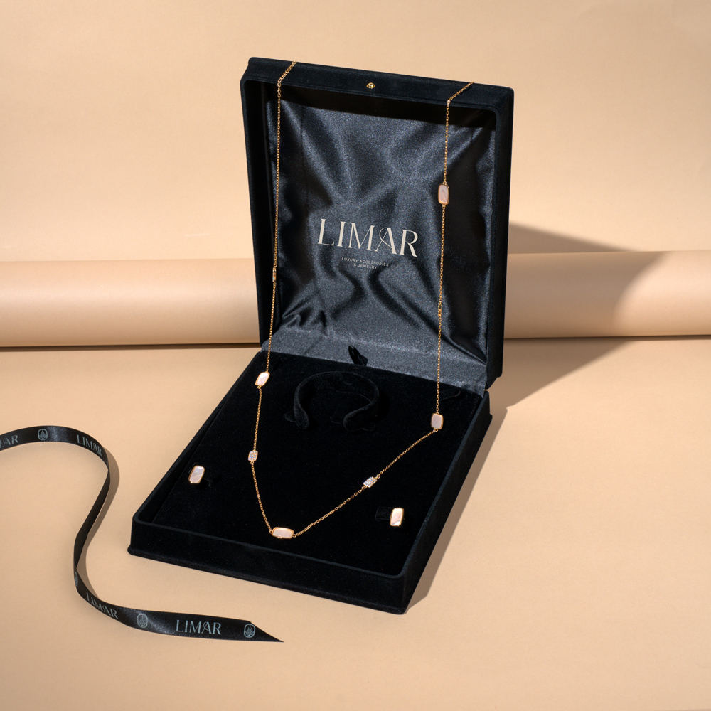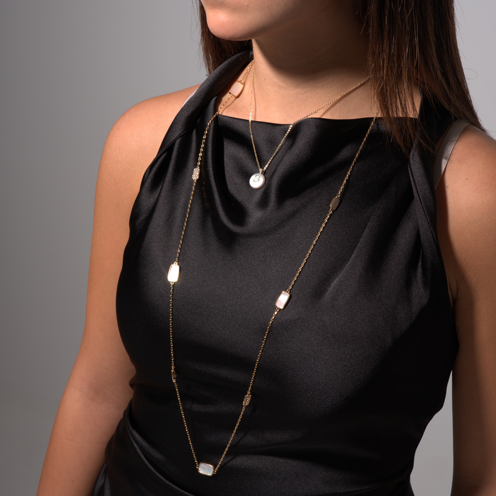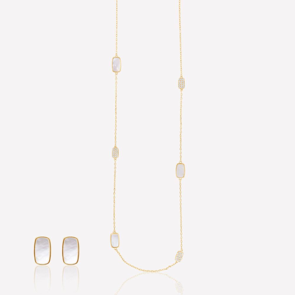 A yellow gold plated long necklace with matching earrings featuring a sparkling malachite colour effect, blending sophistication with contemporary style and adding a touch of luxury to your jewellery collection for any occasion.