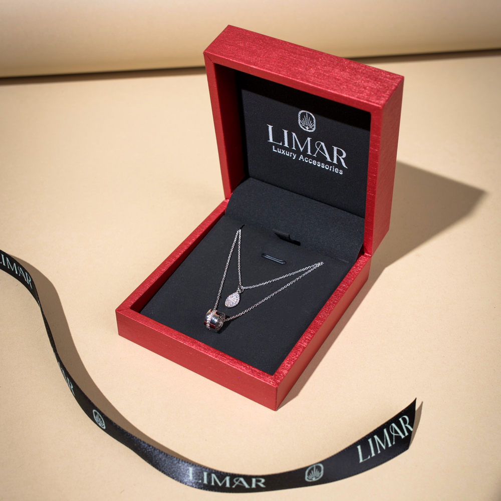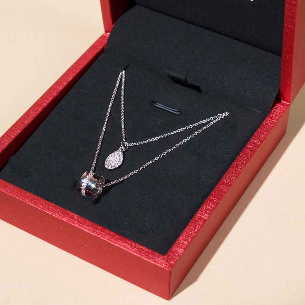 White gold plated two layer pendant drop in a circle design featuring exquisite pure zircon stones, this necklace is designed to add a touch of sophistication to any outfit, the delicate layering creates a beautiful visual effect making it perfect for formal and casual occasions or for everyday wear, the product is plated with the precious metal rhodium to ensure color quality and a perfect long lasting lustre.
