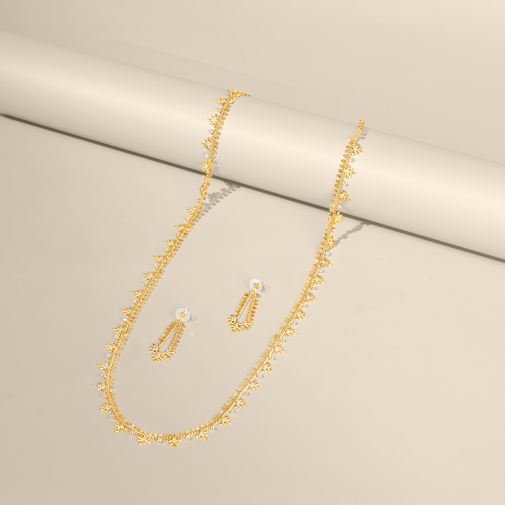 An elegant necklace and earring set, combining luxury and modern elegance. Plated with 21K gold, it radiates a captivating shine that enhances any outfit for daily or formal wear. Meticulously crafted with fine details and premium quality, it’s perfect for daily wear or special occasions, and makes a luxurious gift reflecting exquisite taste.