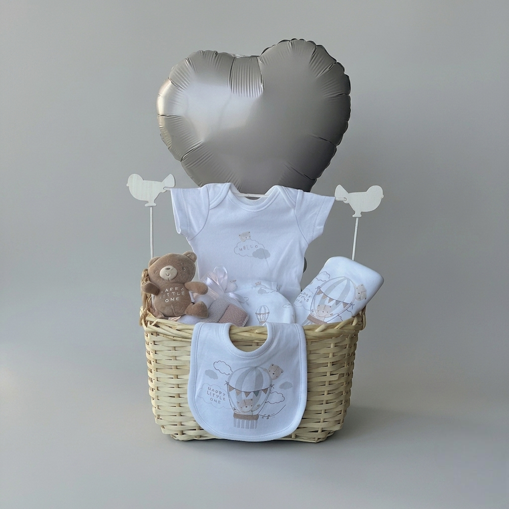 The product includes a basket and a balloon; it contains a baby swaddle with hat, bib, onesie, pants, 3 small towels, small teddy bear, 100% cotton.