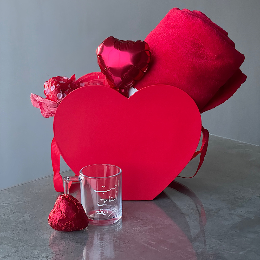 A gift set filled with one-size lenin robe with a makeup bag, a hair tie and a bouquet of roses.