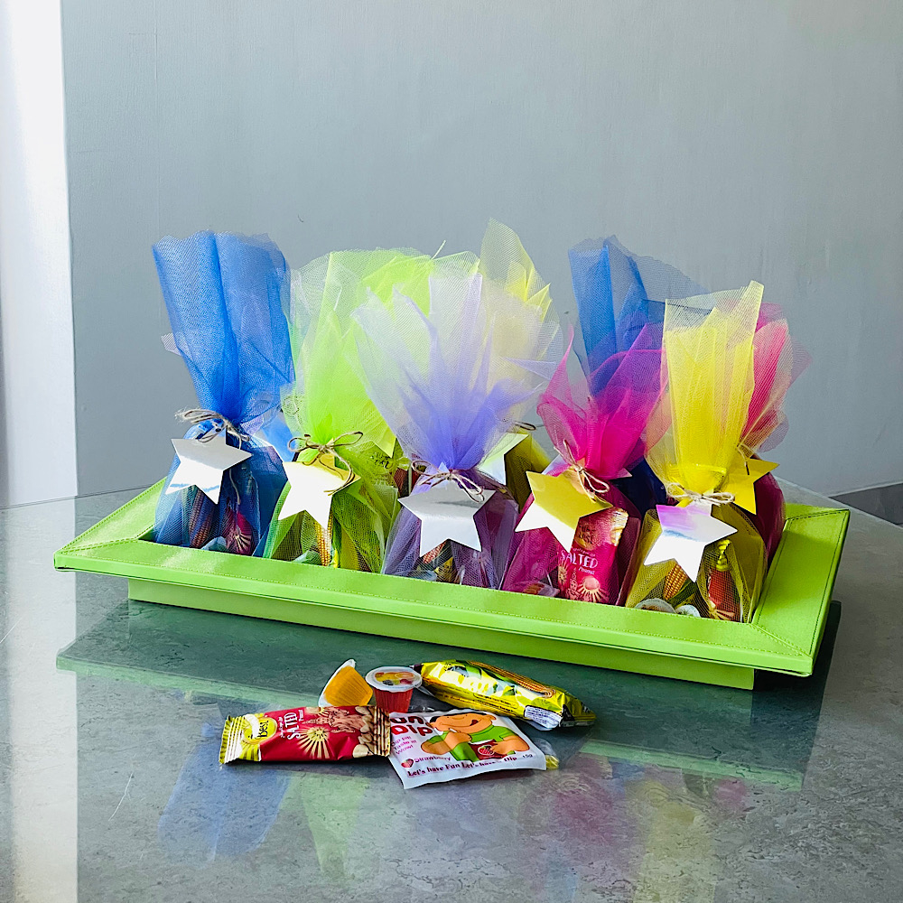 A leather tray containing 10 boxes of sweets and filling.