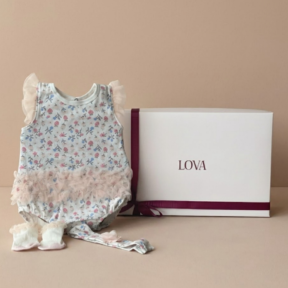 This baby gift contains children's clothing from 3 to 6 months with a head tie and socks.