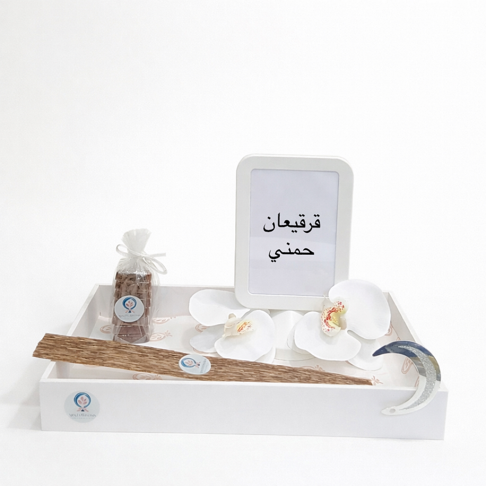 This Gergeaan gift contains bukhour, chocolates, and a frame, arranged in a wooden tray, and comes with gift wrapping.