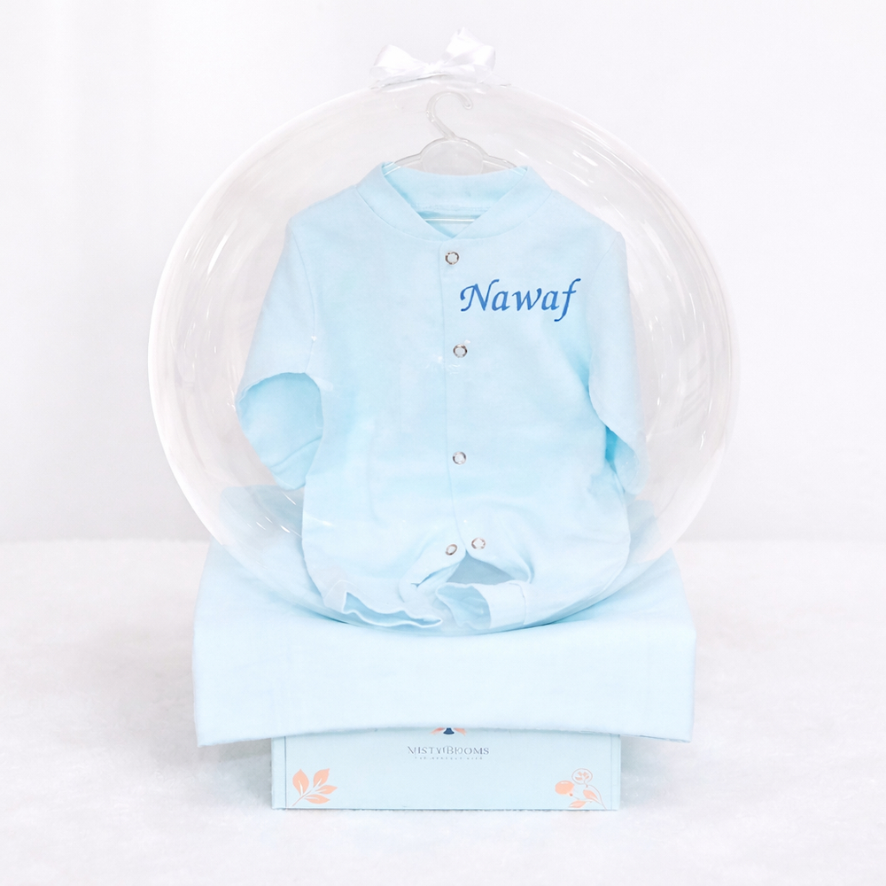 A gift set featuring a baby suit and an embroidered swaddle, beautifully wrapped in a balloon.