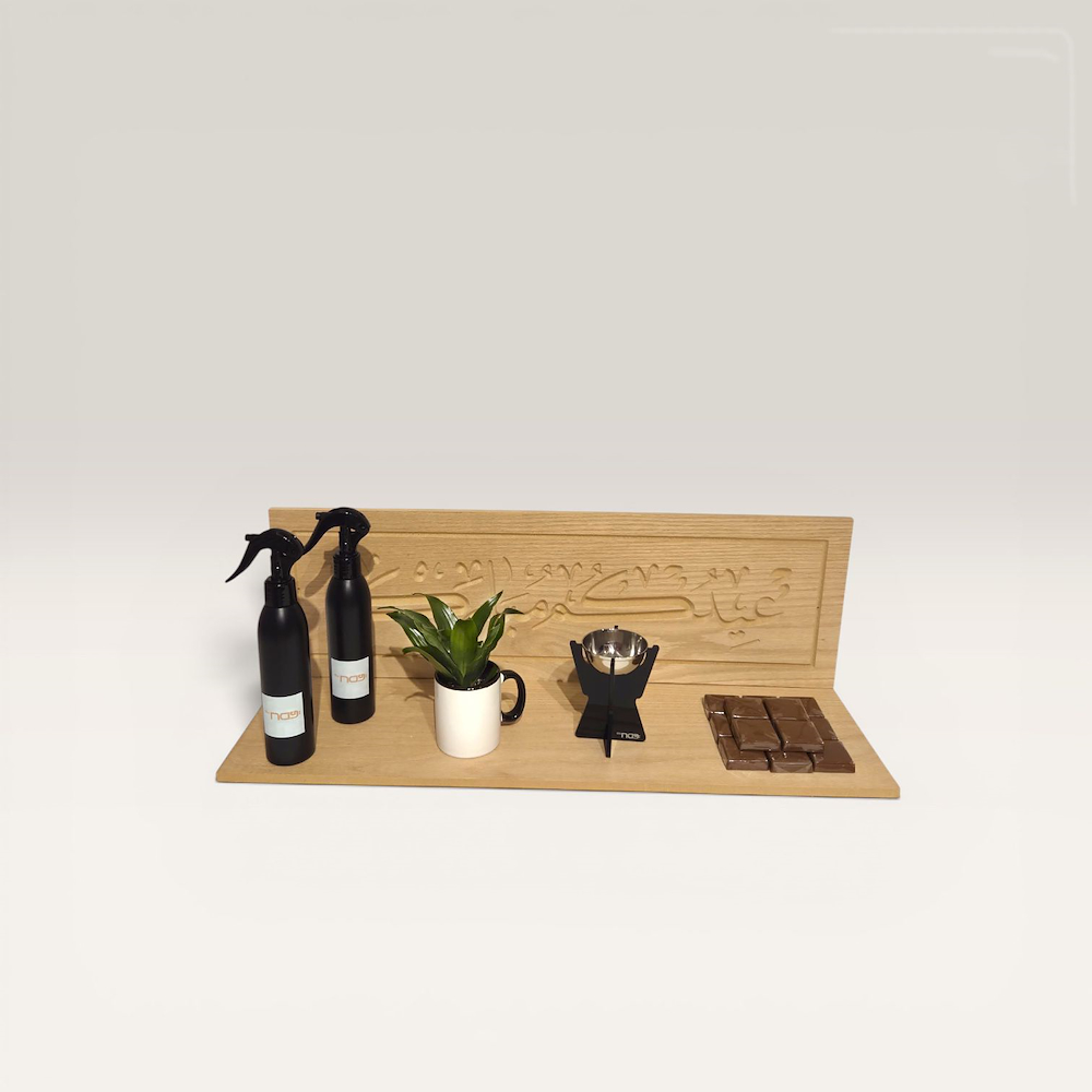 A wooden stand featuring an incense burner, a natural plant, a home fragrance, and chocolate.