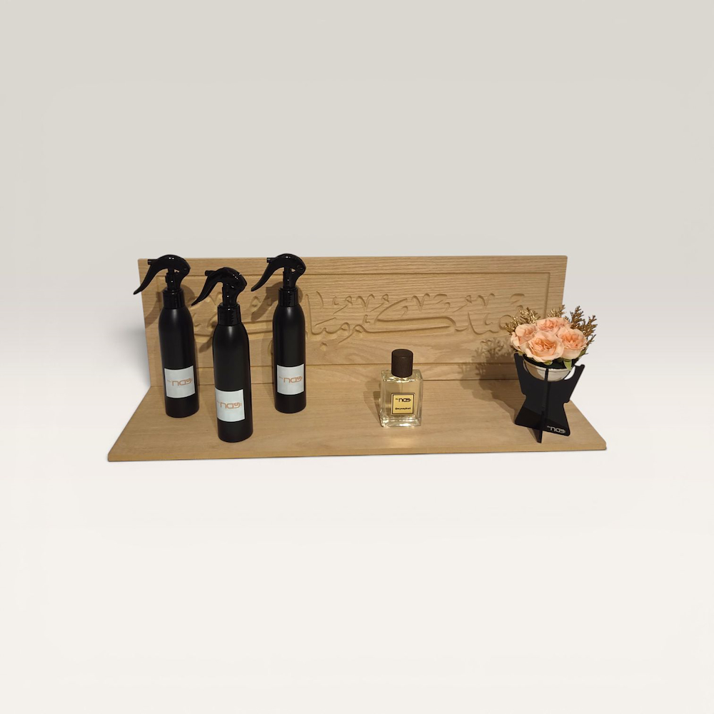A wooden tray featuring an incense burner, a perfume, and a home fragrance.