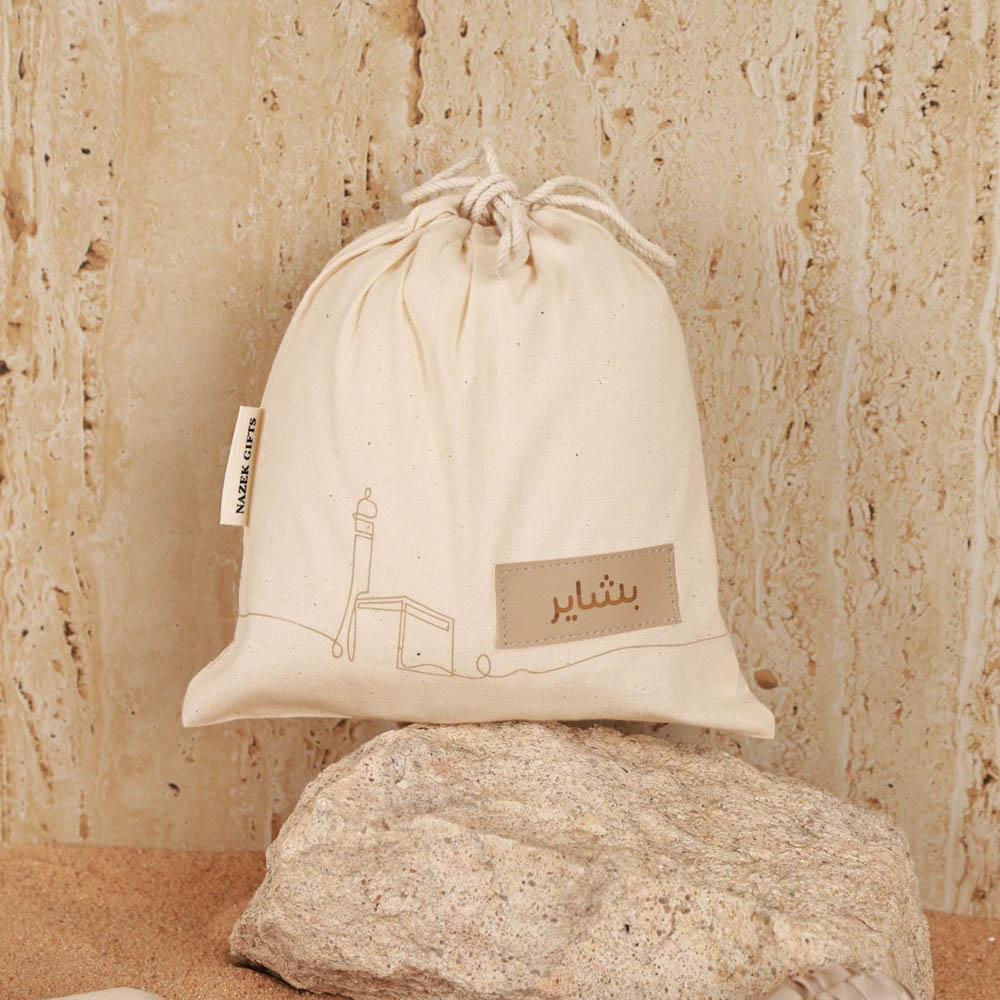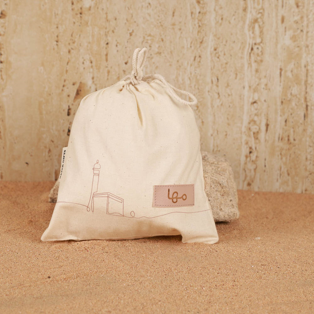 This praying bag consists of a cotton canvas bag, a lightweight praying mat, and a praying skirt made from cotton satin. All items are very light and easy to fold. You can customize it with your name.