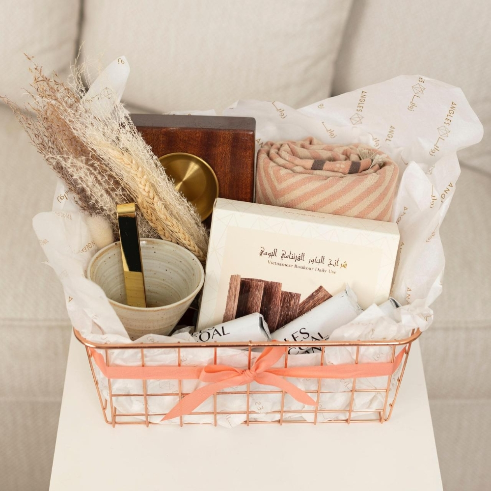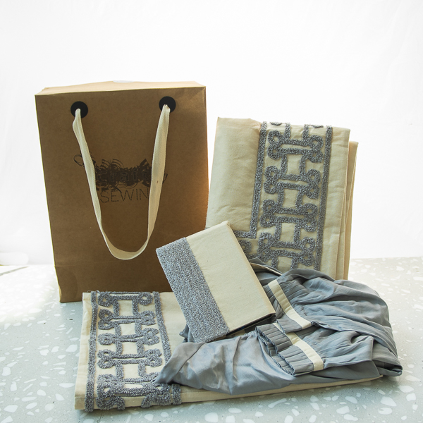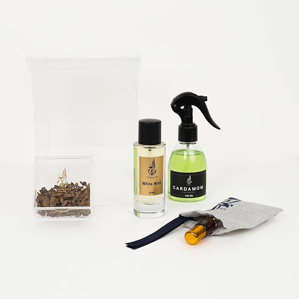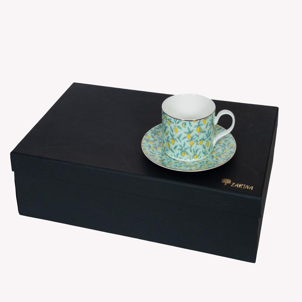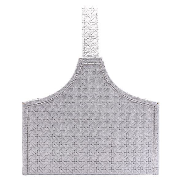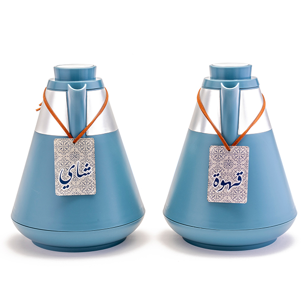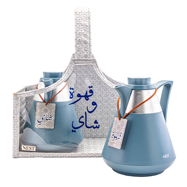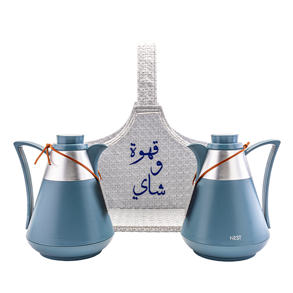 A zwara bag that is made of leather with a transparent window with an elegant design. It contains a set of blue 2 pots with acrylic tea and coffee hangers.