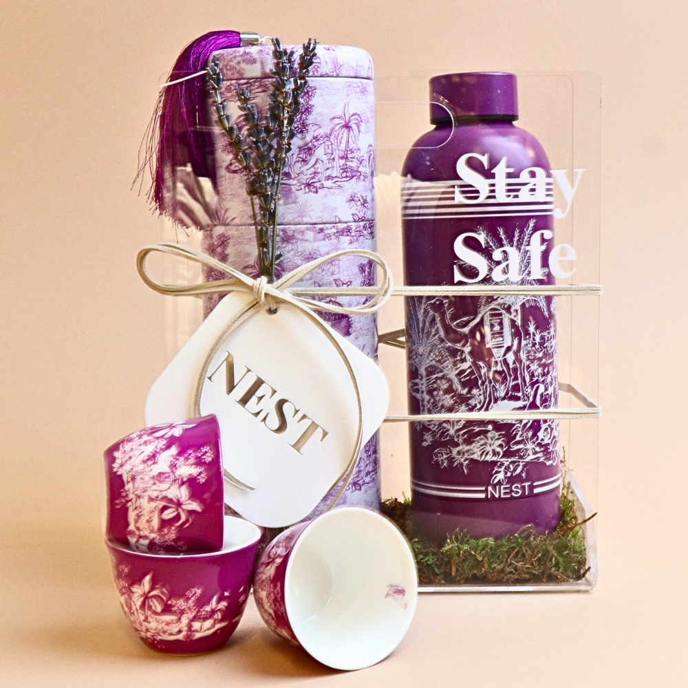 An acrylic gift set featuring a purple Island water bottle with a 500ml capacity that keeps drinks cold for up to 24 hours and hot for up to 12 hours. Made from high quality food grade 304 stainless steel on both the inside and outside, it is 100% BPA free for safe everyday use. The set also includes a purple 3 layer tin box with 3 finjans in the Island design.