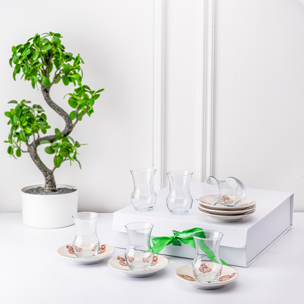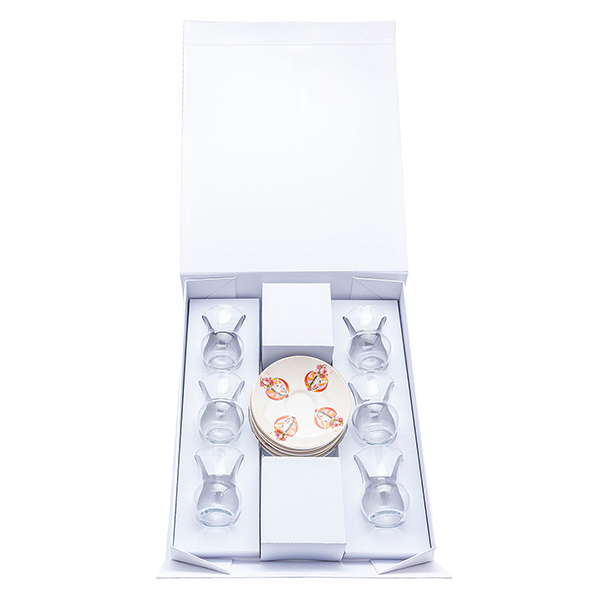 Set 6 pieces of istikana, transparent glass with saucer wed design, this set packed in a premium quality box.
