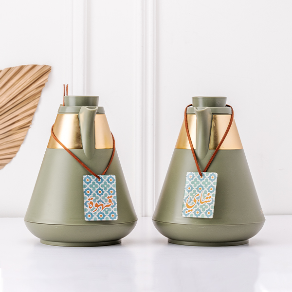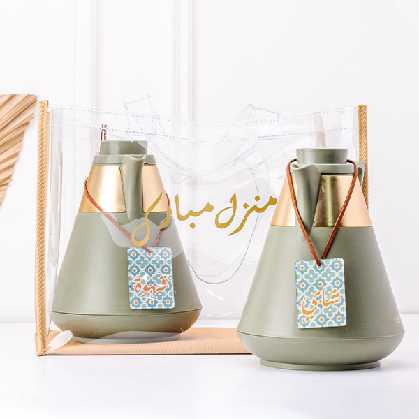 Transparent bag with silver borders consists of: Set of green thermos with labels coffee & tea. Capacity of thermos 1L.