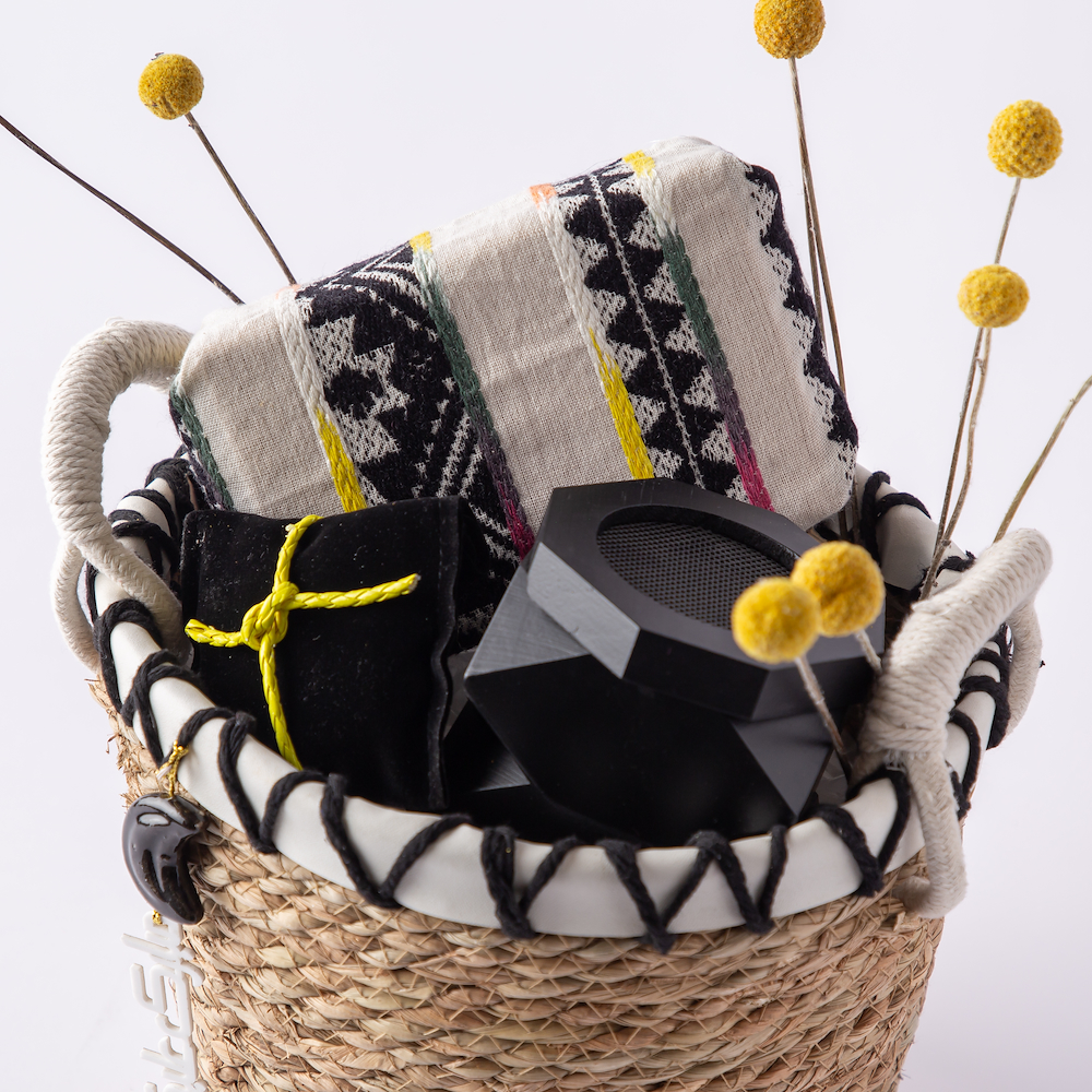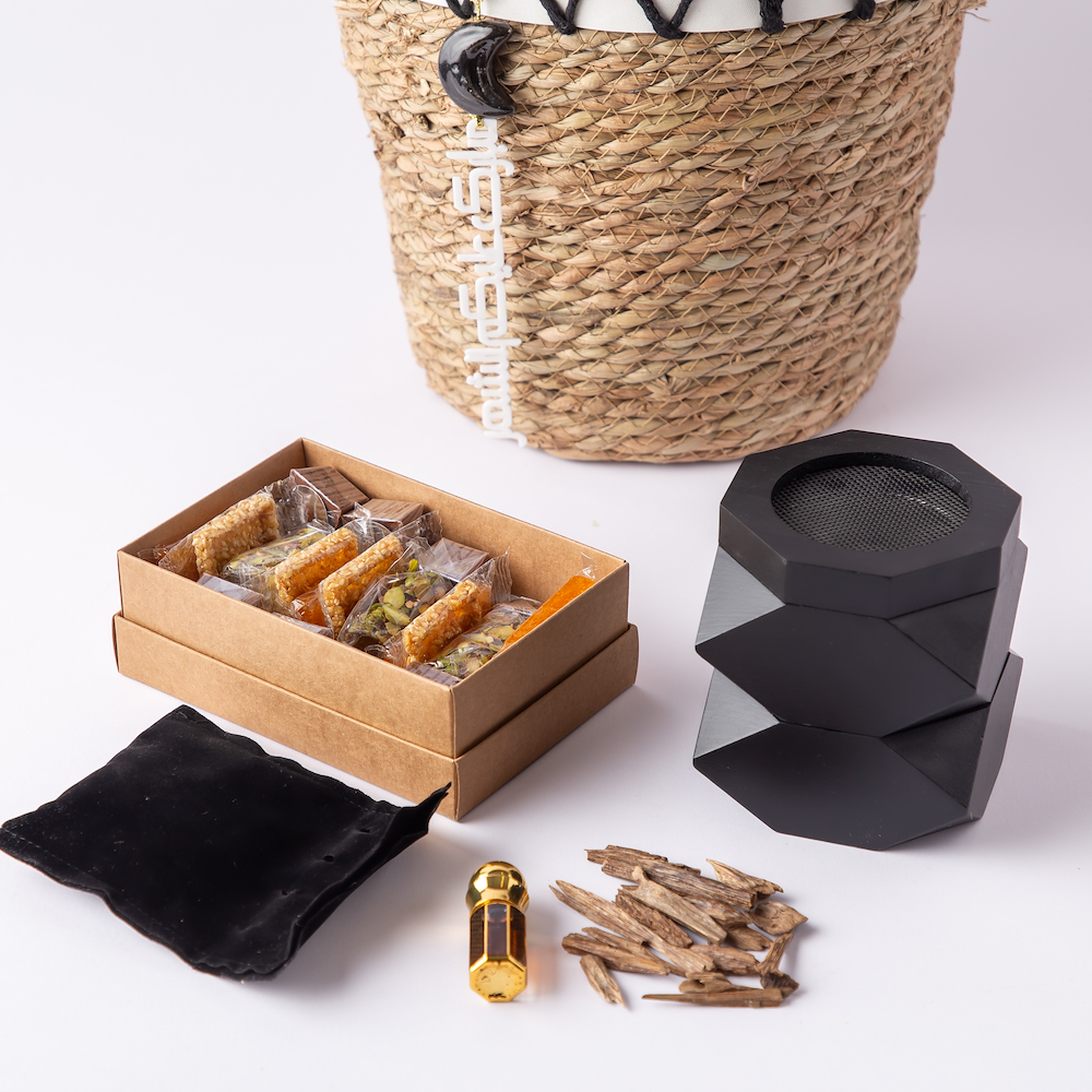 A basket containing a wooden incense burner with a safe cover, oud, bukhour, Arabic sweets, and Belgian chocolates.