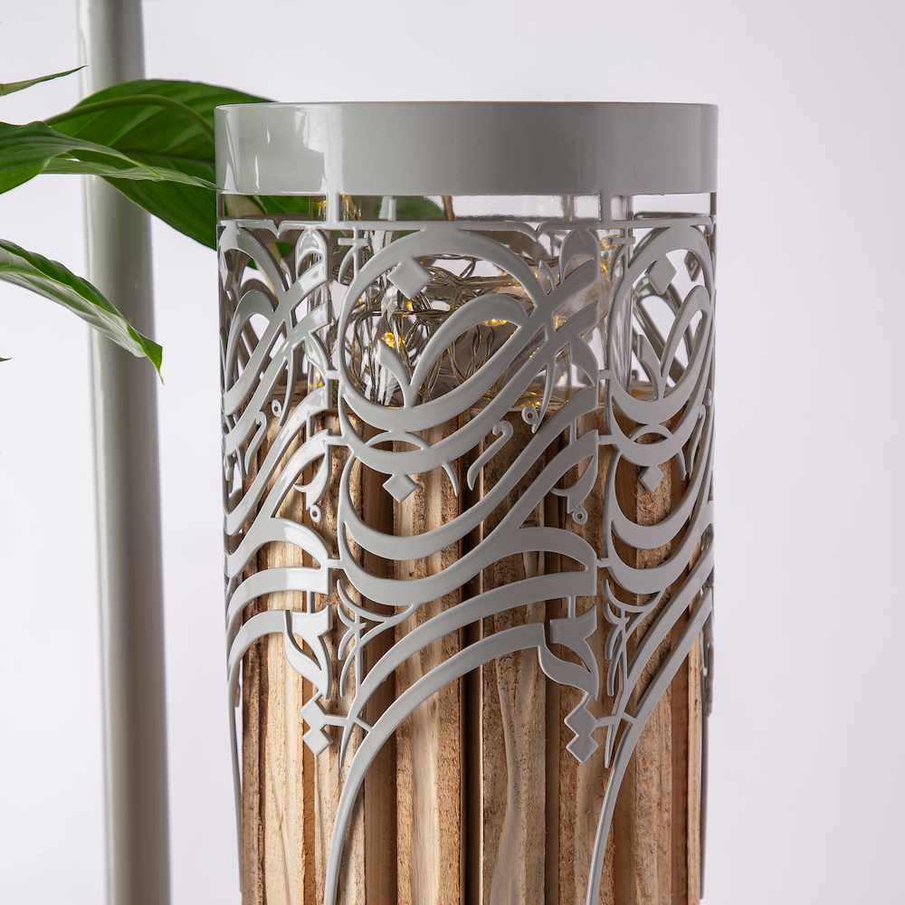 An iron stand with wooden bases featuring a natural plant, including lighting with a cover engraved (Ramadan Kareem).